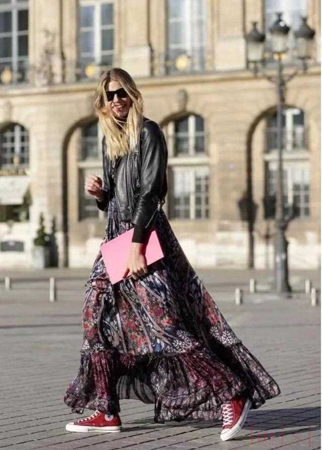 "碎花連衣裙:" 碎花連衣裙本身就帶有青春氣息,搭配彩色運動鞋可以增添活力,打造出法式田園風(fēng)。選擇淺色系的碎花連衣裙,搭配亮色運動鞋,效果更佳。 "牛仔連衣裙:" 牛仔連衣裙是休閑