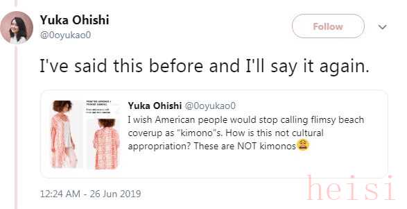 我希望美國人不要再把那種松垮的沙灘服叫“和服”了。這難道不是文化挪用嗎?這些根本不是kimono!今天,我得把這話再說一遍。