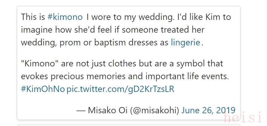 @misakohi :這是我在結(jié)婚時穿的kimono。我希望卡戴珊能設(shè)想一下,如果別人將她在婚禮、舞會或洗禮時的禮服同內(nèi)衣劃等號,她會是什么感受。和服不僅僅是衣服,它還能喚起人們珍貴的回憶和對生活中一些重要的事情的記憶。