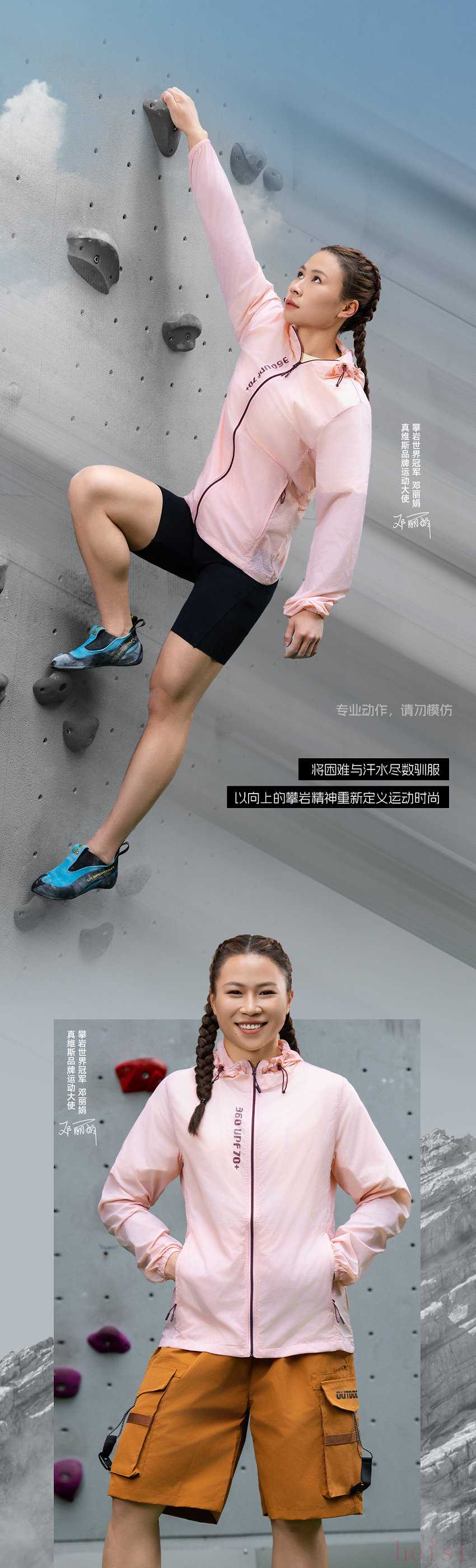 伴隨著官宣消息的發(fā)布,真維斯釋出了品牌運動大使鄧麗娟系列官宣形象,圍繞攀登時刻、徒步森林、礁石海岸、休閑探索等多個戶外運動場景,盡顯“速度女王”的力與美。作為速度攀巖領域的女性運動員,鄧麗娟無懼挑戰(zhàn)男子攀巖動作,將男性化、高難度的攀巖技巧融入自己的比賽風格中,不僅打破了競技體育中對性別的刻板印象,還展現(xiàn)了她超強的速度攀巖技巧與過硬的專業(yè)實力。面對攀巖過程中的重重困難,鄧麗娟展現(xiàn)出了驚人的毅力和決心,從不停止追逐夢想的腳步。作為真維斯品牌運動大使,鄧麗娟以專業(yè)實力詮釋品牌“創(chuàng)新與突破”的理念,也在實際行動中傳遞“不破不立”的真正含義。