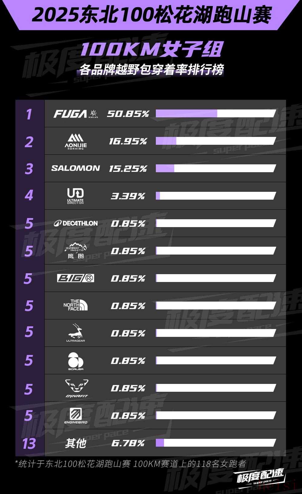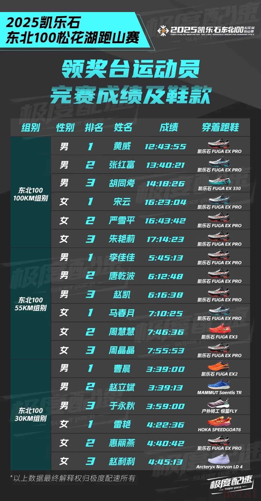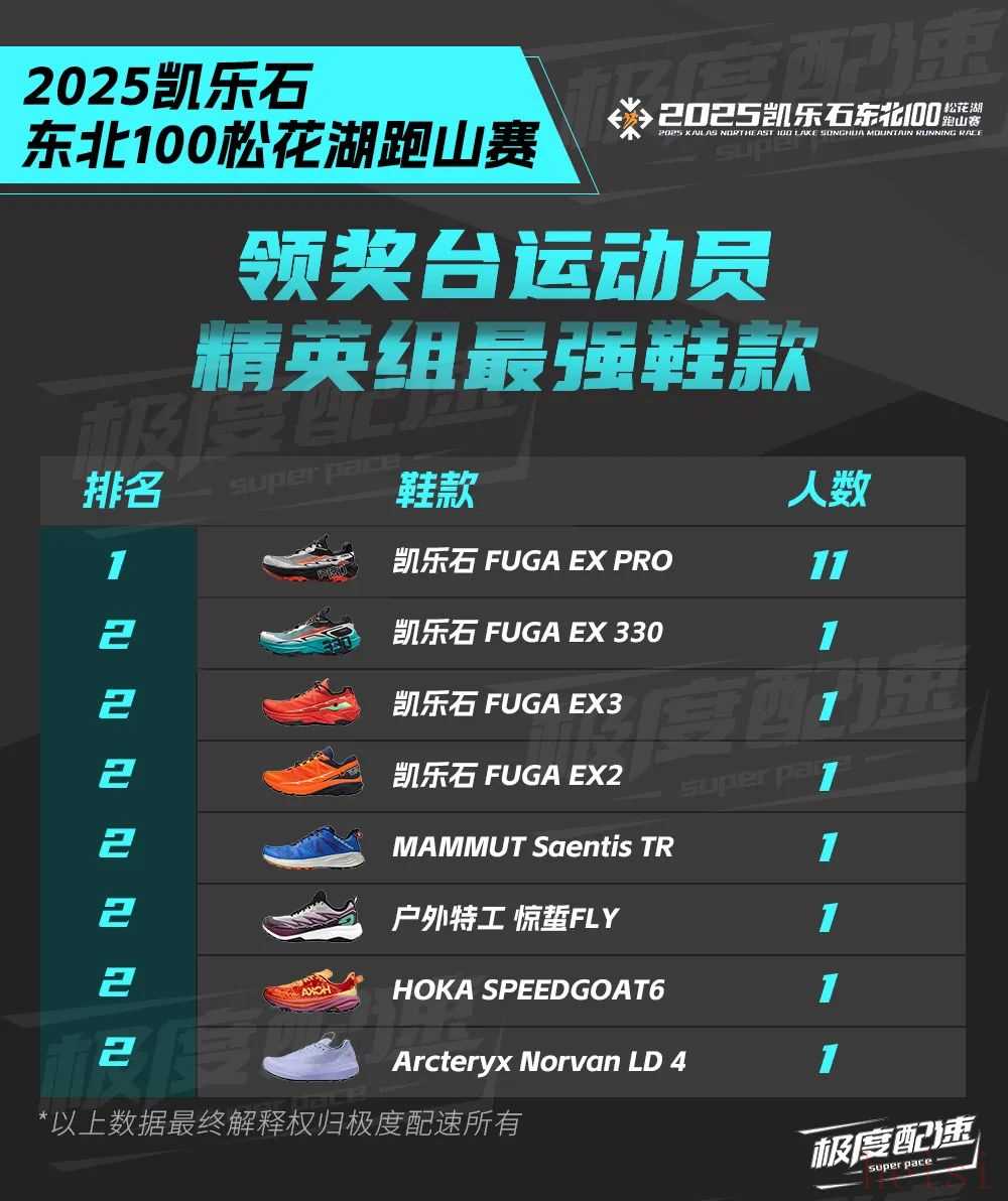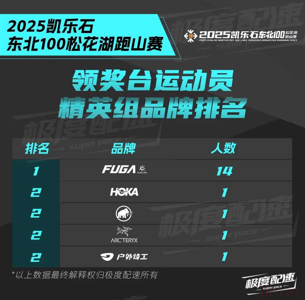 整個領獎臺18為選手中,凱樂石FUGA獨占14個席位。東北100賽道上戶外特工、始祖鳥和猛犸象也登上了領獎臺,在極度配速統(tǒng)計過的越野跑領獎臺數據中實不多見,但品牌更為豐富才是我們樂于見到的局面。