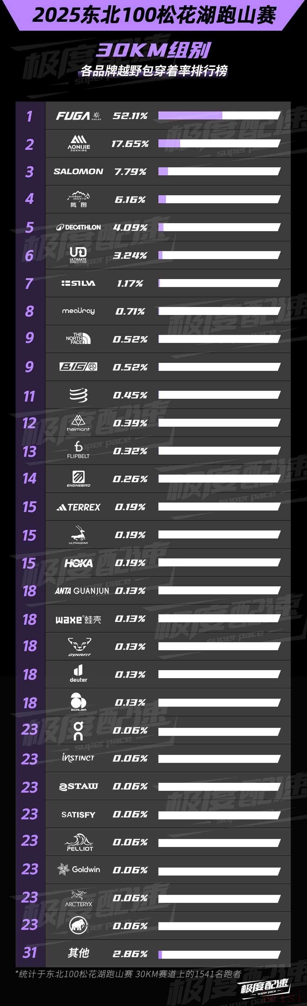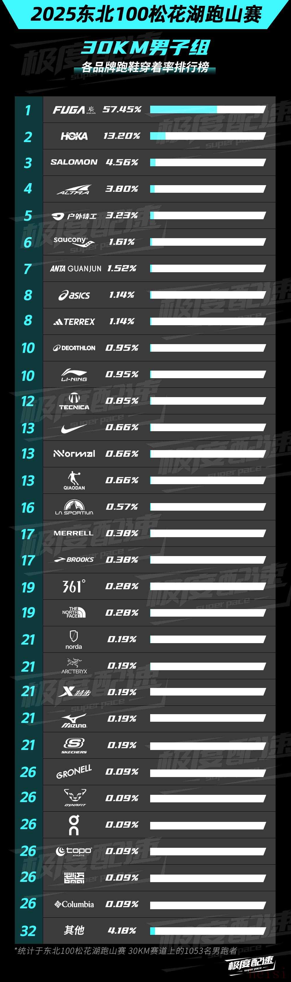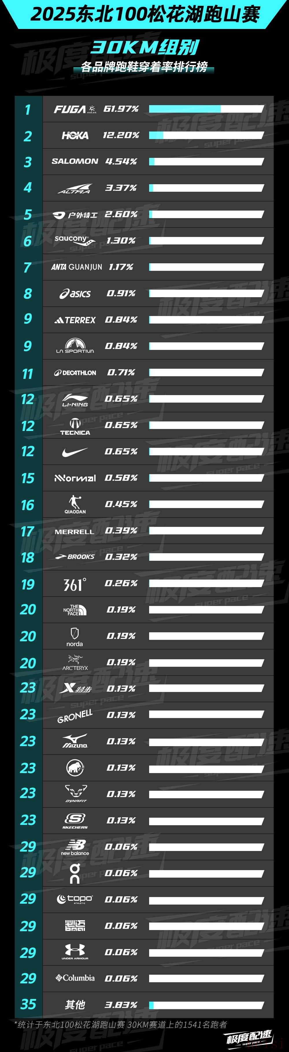 進入30KM組別,戶外特工奪回了安踏冠軍在上個組別中丟掉的位置,與全局前5名的占比相呼應。但占比超過10%的品牌依然只有凱樂石FUGA和HOKA,前者占比為61.97%后者為12.20%。