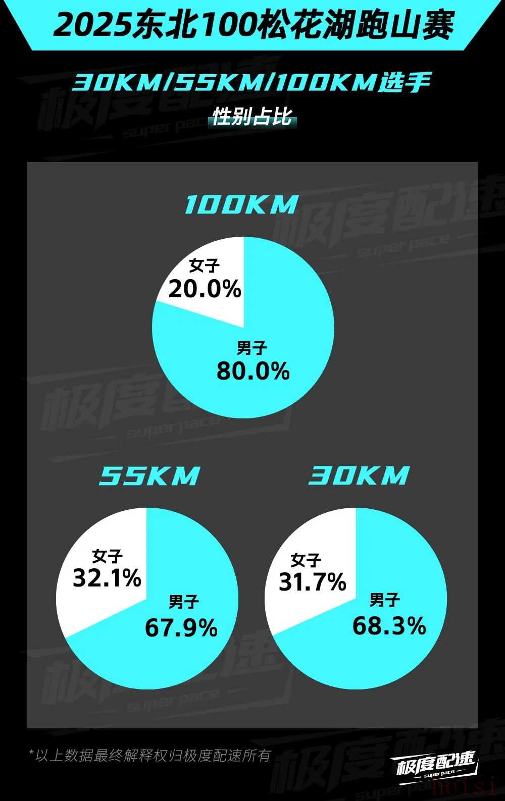 東北100賽道上男女選手比例整體7:3趨勢,有趣的是這個數字精確到小數點后1位所呈現(xiàn)的結果與崇禮168完全一致,可見至少這兩場比賽參賽選手的性別占基本呈現(xiàn)穩(wěn)定狀況??v觀全國各大賽事又將呈現(xiàn)怎樣的變化,也是后續(xù)極度配速數據統(tǒng)計的重點環(huán)節(jié)。