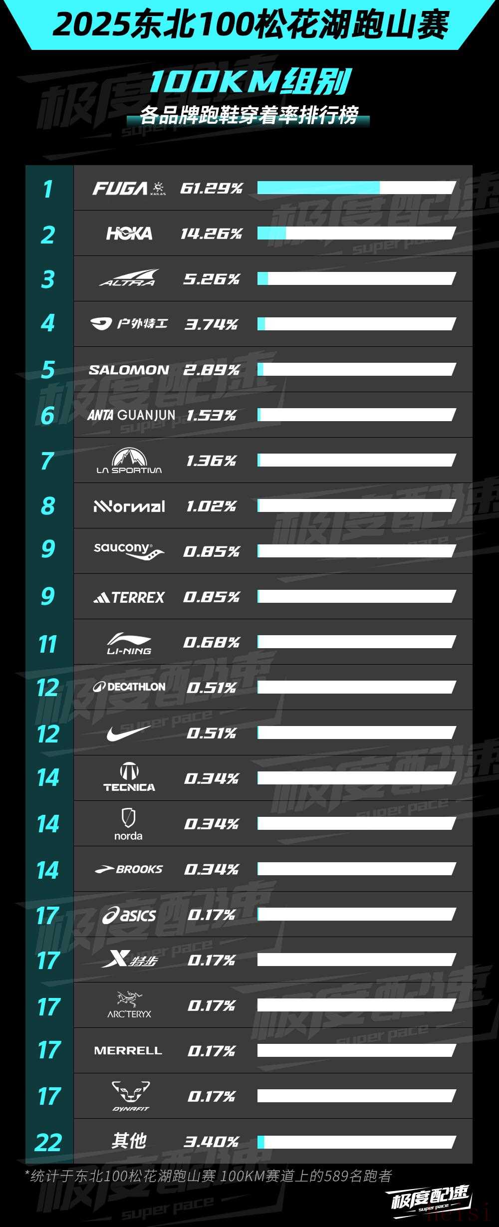凱樂石FUGA EX PRO成為領獎臺上人氣最高的鞋款,100KM和50KM的男女冠軍都穿著了這雙鞋,可見鞋款在長距離和中距離環(huán)節(jié)均能帶來良好表現(xiàn)。英雄榜環(huán)節(jié)凱樂石FUGA交出了一份頗具統(tǒng)治力的答卷,這是否意味著大眾選手們的占比趨勢也將與此共鳴呢?還有哪些品牌會在大眾選手數據榜單上驚艷我們呢?