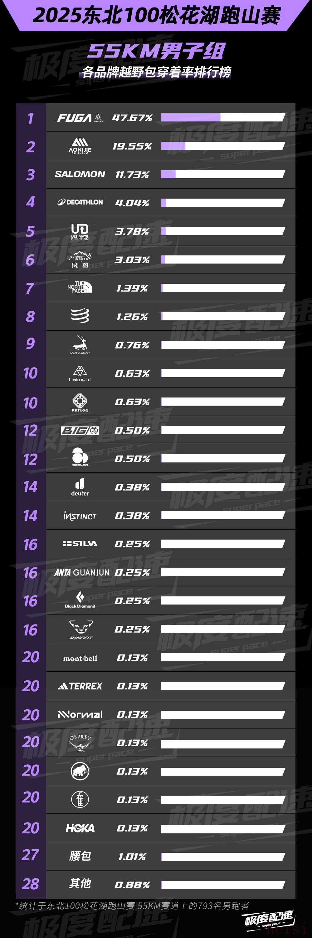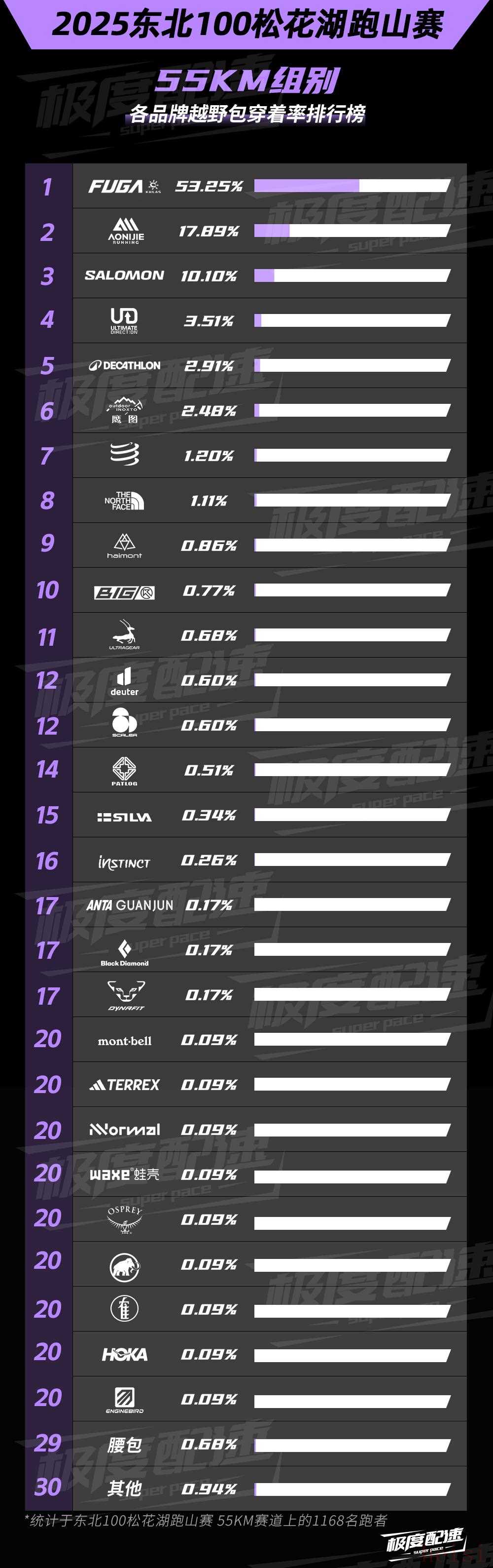 數據必然是這些答案之中的一個,這場東北地區(qū)的特色賽事都有誰來參加?他們呈現(xiàn)出怎樣的趨勢?極度配速團隊在東北100賽道上統(tǒng)計了100KM/55KM/30KM這3個組別,累計3298(男子:2767/女子:1161)名跑者的鞋履、背包穿著情況,來看看哪些品牌在這片肥沃黑土上留下了深刻印記。