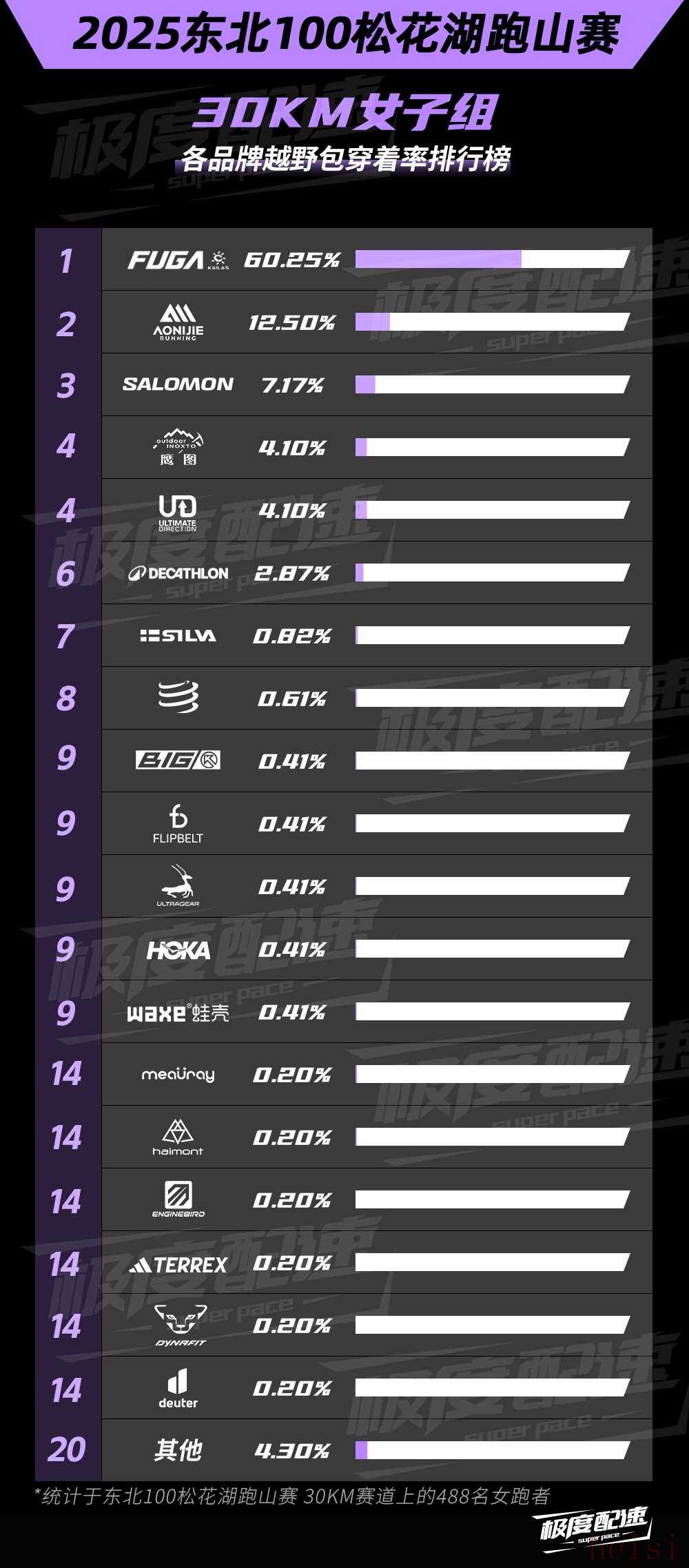 性別分組中,李寧在男子組層面也擠進前10名,可見本組男跑者對的盧系列偏愛有加,而女子組方面Lululemon首次在今日榜單中出現(xiàn),這也能夠看出男女跑者之間品牌選擇的偏好。但不論哪一種偏好,凱樂石FUGA、HOKA、SALOMON和ALTRA依然是整個組別的BIG 4。尤其是女子組環(huán)節(jié)凱樂石FUGA占比接近7成在過往賽事上非常罕見,顛覆過往我們所積累的經驗。