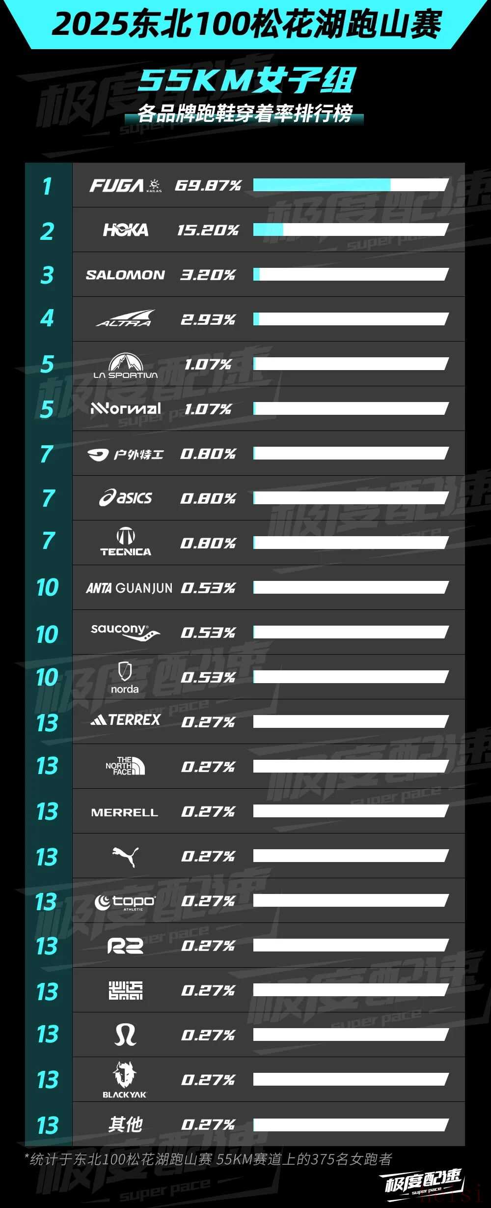 進入男女分區(qū)情況變得更為「壓迫」,55KM組別女子組凱樂石FUGA只是接近7成,而在本組實現(xiàn)了「7」的突破,71.12%的占比確實是太過強大,凱樂石FUGA已經成為中國越野跑山品牌的名片。東北100賽道上鞋款的數據占比可以說是凱樂石FUGA的「一支獨秀」,相比崇禮168的數據,凱樂石FUGA在本次比賽再度拉大了與HOKA之間的差距,或許接下來很多年在這條賽道上,都將成為群雄團戰(zhàn)凱樂石FUGA的局面。