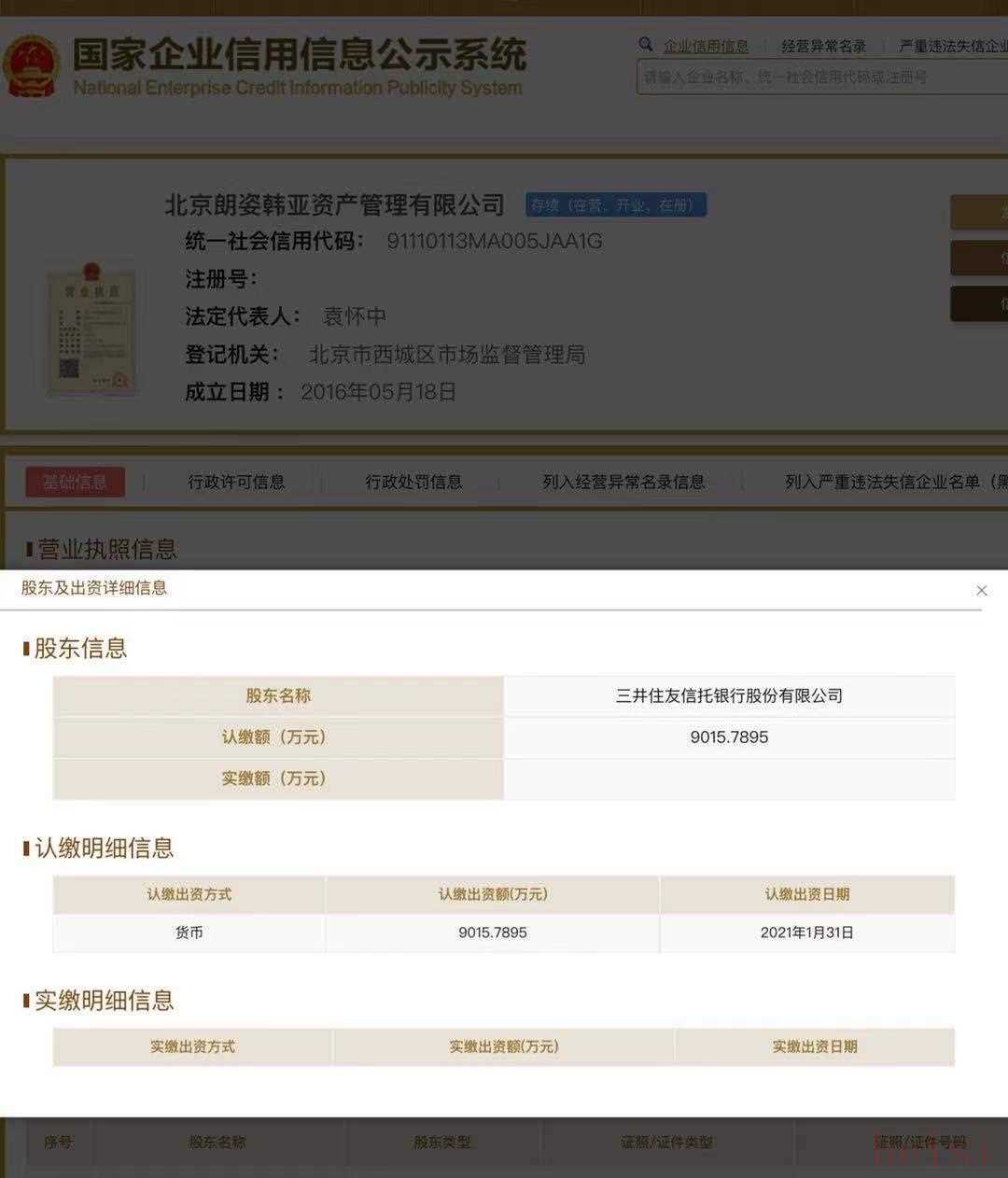 新京報貝殼財經(jīng)記者查詢國際企業(yè)信用信息公示系統(tǒng)發(fā)現(xiàn),朗姿韓亞資管日前增加一個新股東三井住友信托銀行股份有限公司(以下簡稱“三井住友”)。三井住友認(rèn)繳出資額約為9015.79萬元,認(rèn)繳出資日期為2021年1月31日。