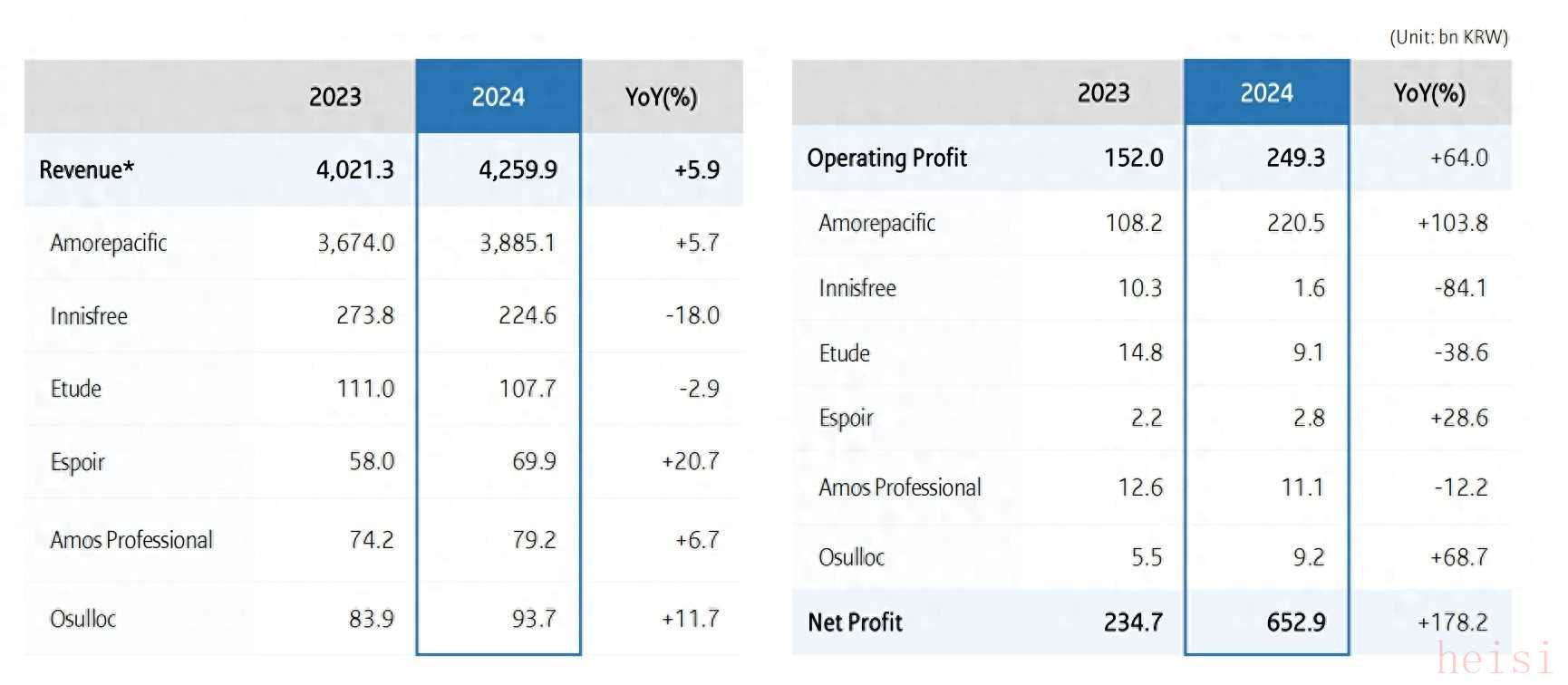 財報顯示,2024年,悅詩風吟(Innisfree)實現(xiàn)營收2246億韓元,同比下降18%,營業(yè)利潤為16億韓元,同比下降84.1%;伊蒂之屋(Etude)實現(xiàn)營收1077億韓元,同比下降2.9%,營業(yè)利潤為148億韓元,同比下降38.6%。