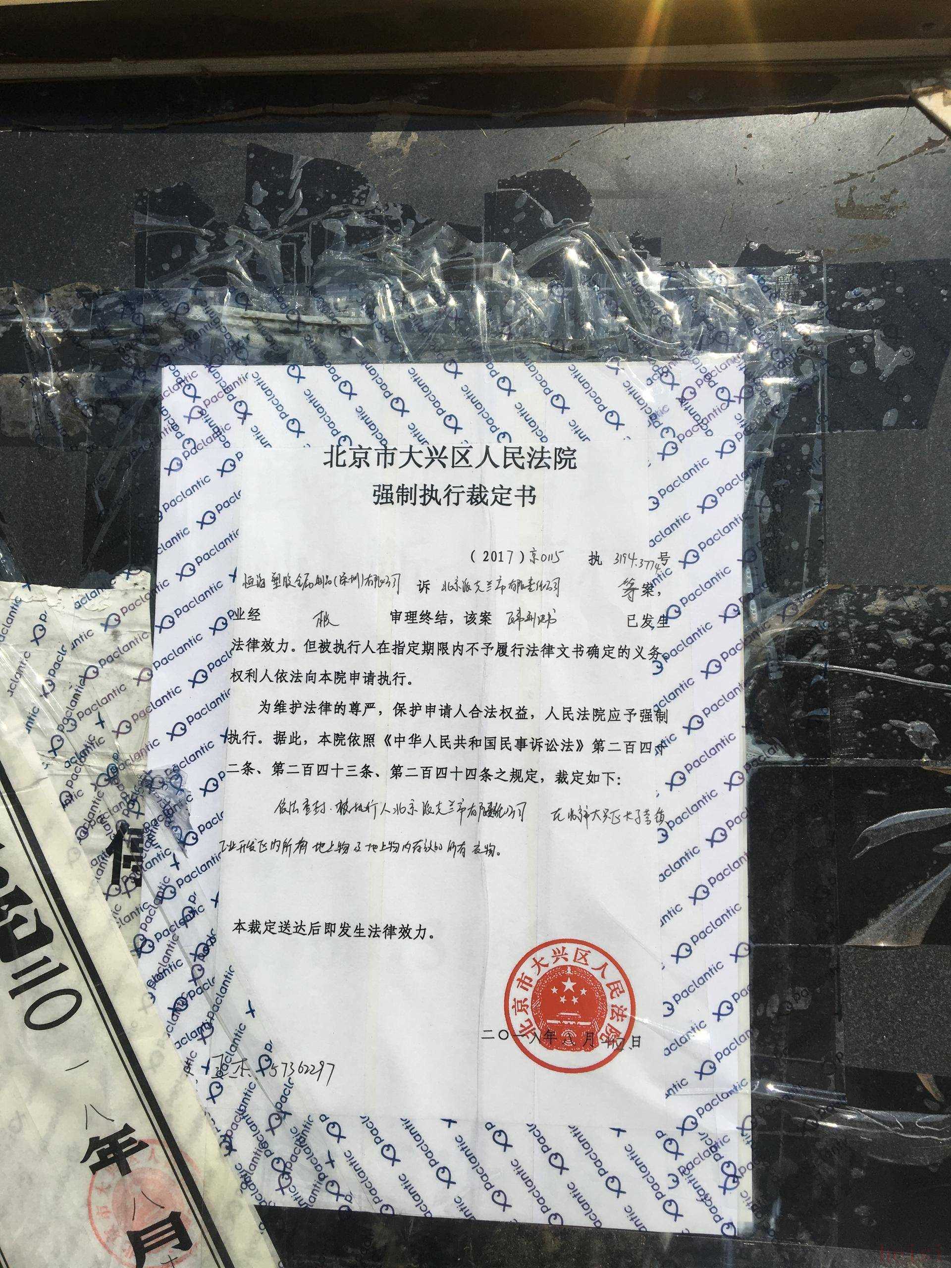 北京派克蘭帝有限責(zé)任公司的廠房已于2018年8月14日被北京市大興區(qū)人民法院貼上強(qiáng)制執(zhí)行裁定書(shū)和封條。小犀財(cái)經(jīng)撥打廠房門口遺留電話得知,人員已被遣散。對(duì)方表示,自己也是最近臨時(shí)被招過(guò)來(lái)看門,并表示不認(rèn)識(shí)童創(chuàng)童欣的新任董事長(zhǎng)張道安。