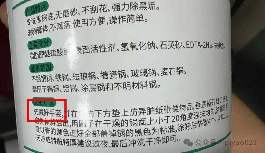 鍋具去污劑含有堿性成分,同樣要佩戴手套使用,并且清洗干凈(作者攝)。