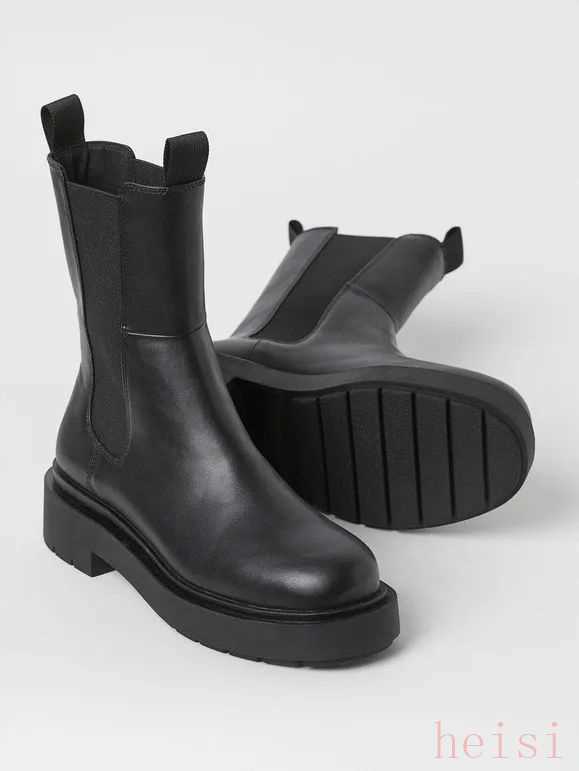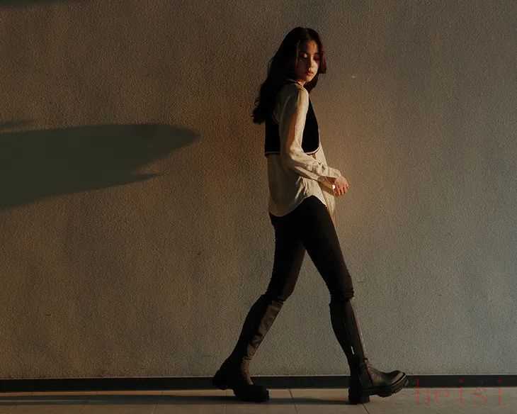 首先,肉眼可見(jiàn)的是,這雙靴子的高度比之前的切爾西短靴要高一些,長(zhǎng)至小腿肚。這個(gè)高度對(duì)于沒(méi)腳踝星人來(lái)說(shuō)相當(dāng)友好,再加上腳踝位置收緊的設(shè)計(jì),它會(huì)比普通款更修飾腳型,同時(shí)也保有切爾西靴干凈干練的感覺(jué)。