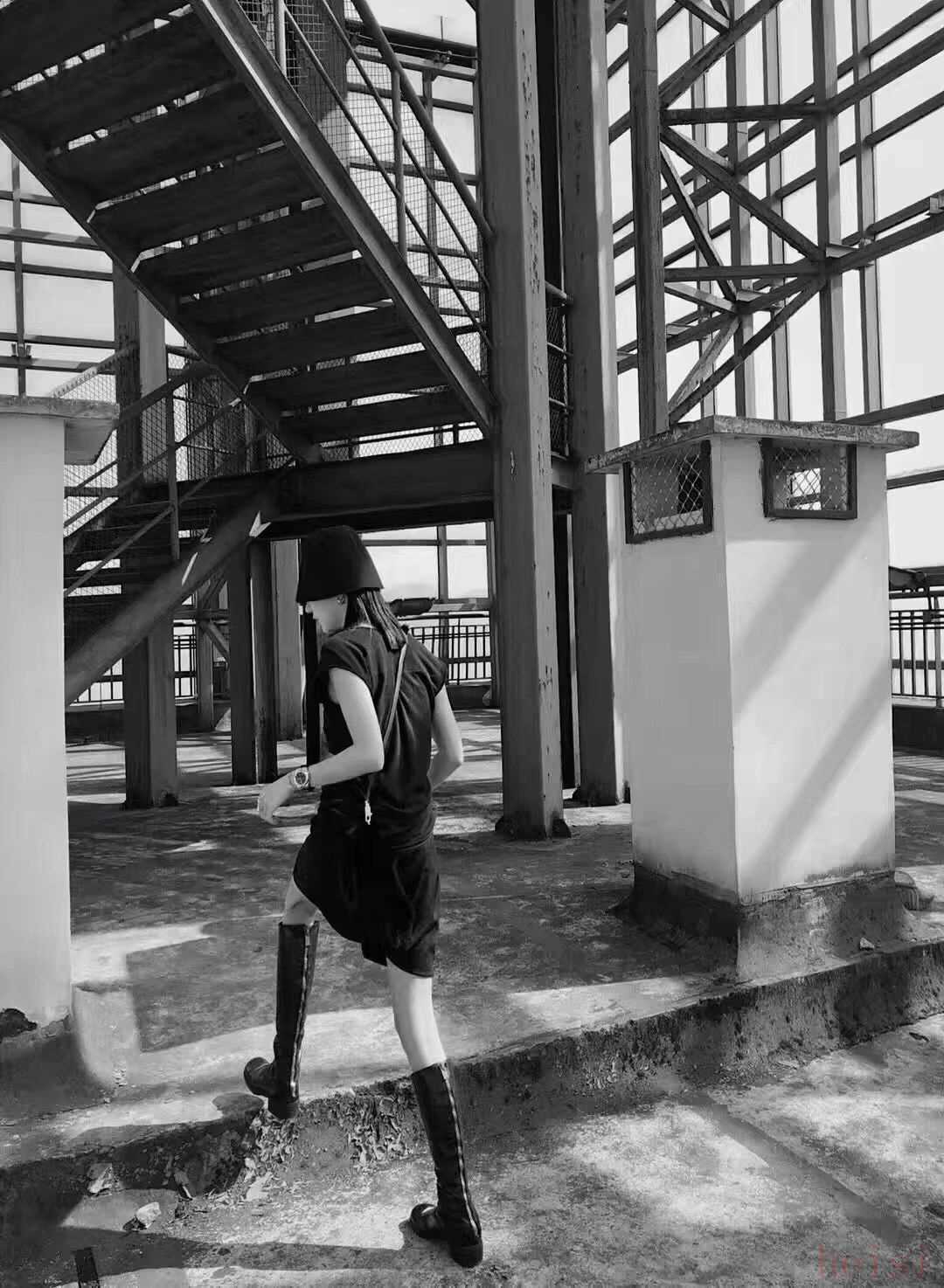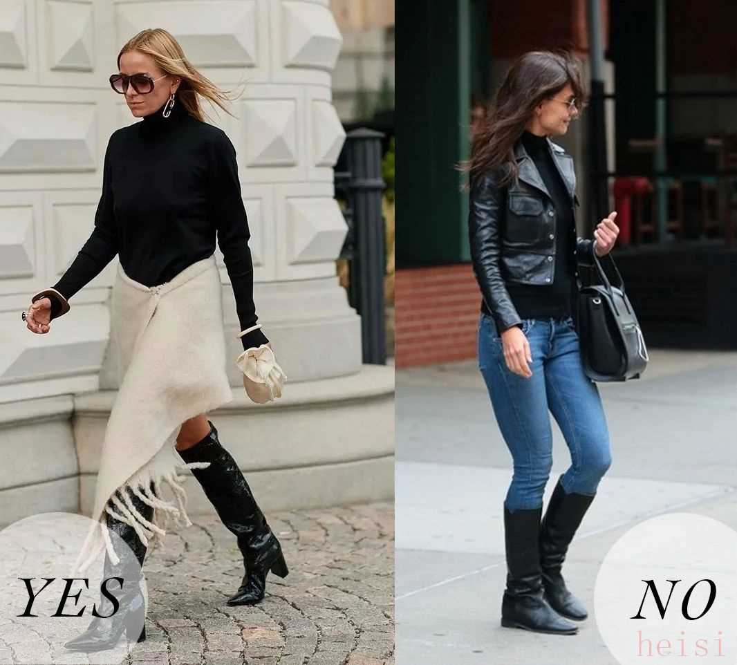 黑色本身就是收縮色,再加上靴子的二次收緊,視覺上get一雙又細(xì)又長的美腿。