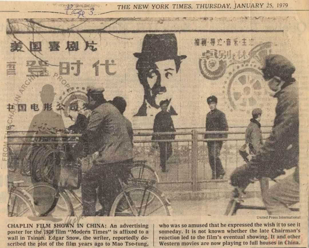 ▲1979年《紐約時(shí)報(bào)》剪報(bào)。改革開放之初,剛打開國門,《摩登時(shí)代》以及其他美國大片在中國上映