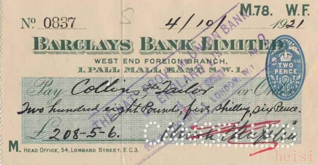 ▲卓別林購置Turnbull & Asser襯衫的支票,Turnbull & Asser是英國王室御