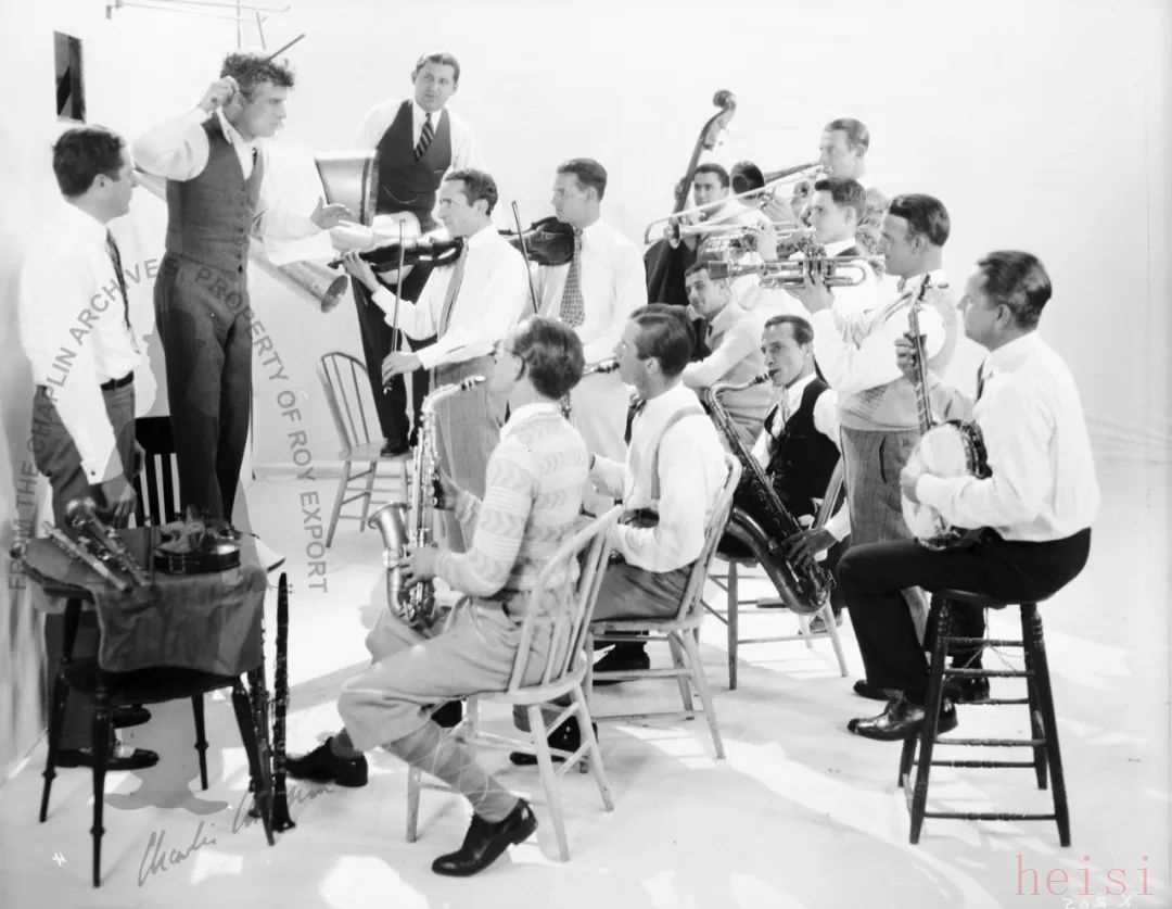 ▲卓別林在洛杉磯的布朗斯維克錄音室指揮安倍萊曼樂團(tuán),同時(shí)拍攝《淘金記》