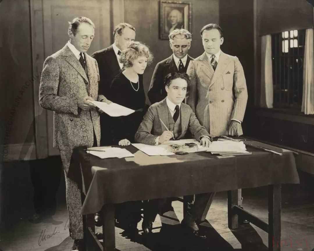 ▲璧克馥、范朋克、格里菲斯和卓別林在簽訂合同