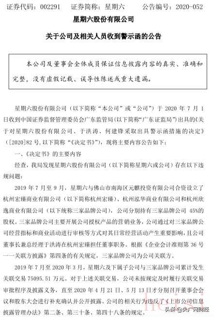 《決定書》表示,于洪濤作為星期六的董事長兼總經(jīng)理,何建鋒作為公司董事會(huì)秘書,未按照《上市公司信息披露管理辦法》第三條的規(guī)定履行勤勉盡責(zé)義務(wù),對公司上述違規(guī)行為負(fù)有主要責(zé)任。