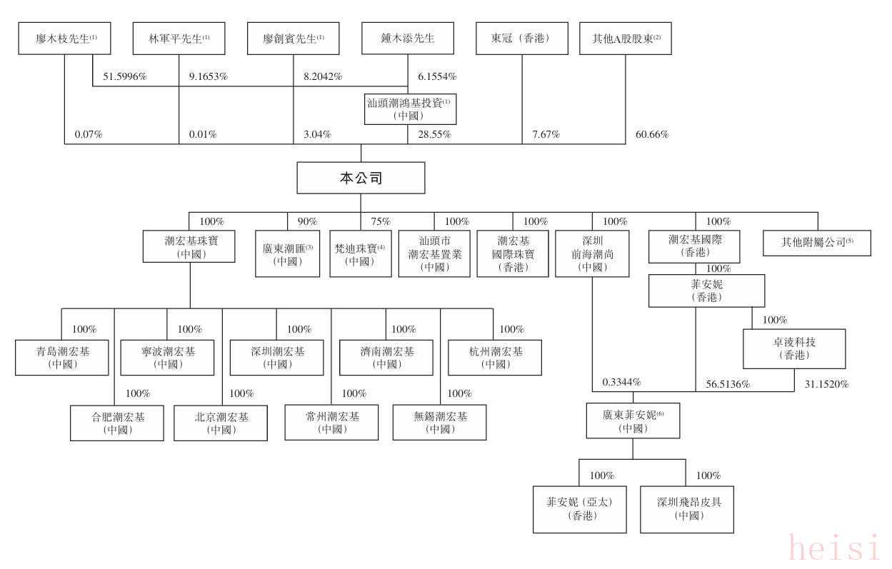 據(jù)悉,潮宏基的歷史可追溯至1996年3月,潮陽(yáng)市潮鴻基實(shí)業(yè)(其在成立時(shí)為廖木枝持有51.9%權(quán)益的公司)與廖堅(jiān)洪在中國(guó)成立潮宏基的前身汕頭潮鴻基。經(jīng)過(guò)數(shù)輪股權(quán)變更后,汕頭潮鴻基于2006年9月改制為股份有限公司。招股書顯示,在潮宏基股權(quán)架構(gòu)中,廖木枝、林軍平、廖創(chuàng)賓為一致行動(dòng)人士,合計(jì)持股約31.67%,為單一最大股東集團(tuán)。