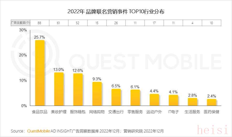 QuestMobile的數(shù)據(jù)顯示,2022年,食品飲品是品牌聯(lián)名營銷事件排名TOP1的行業(yè)。聯(lián)名破圈的力量依然可觀,通過聯(lián)名制造熱點、觸達目標(biāo)人群的品牌和頻次都有所增加。
