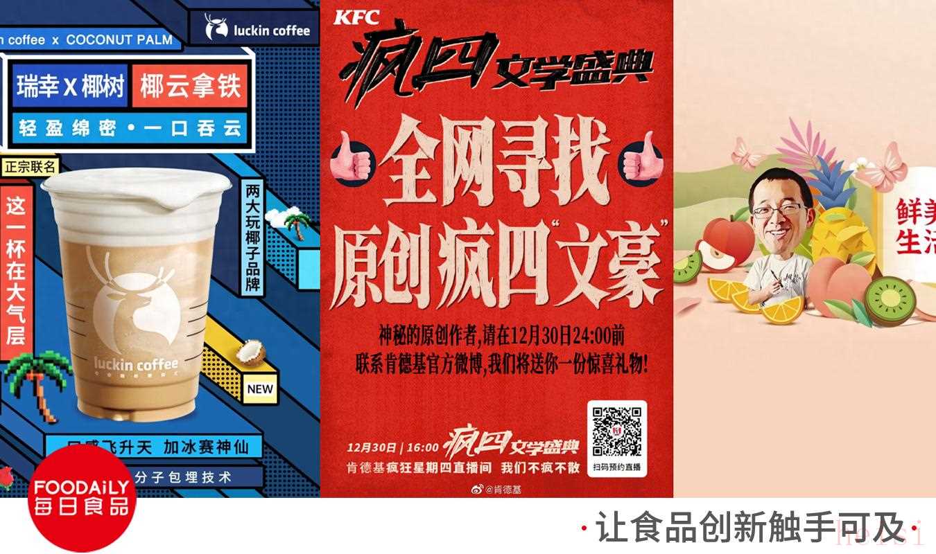 從食品營銷來看,F(xiàn)oodaily每日食品發(fā)現(xiàn),食品行業(yè)的營銷多了很多創(chuàng)意新奇的玩法:從蜜雪冰城黑化、“不正經(jīng)的官方賬號”、瑞幸、元氣的北京冬奧會押冠,再到肯德基的“瘋四文學(xué)”......越來越多的品牌營銷事件出圈、品牌們也越來越在溝通元素上吸引用戶共鳴,共創(chuàng)一個個“爆?!?,營銷也變得越來越內(nèi)卷。