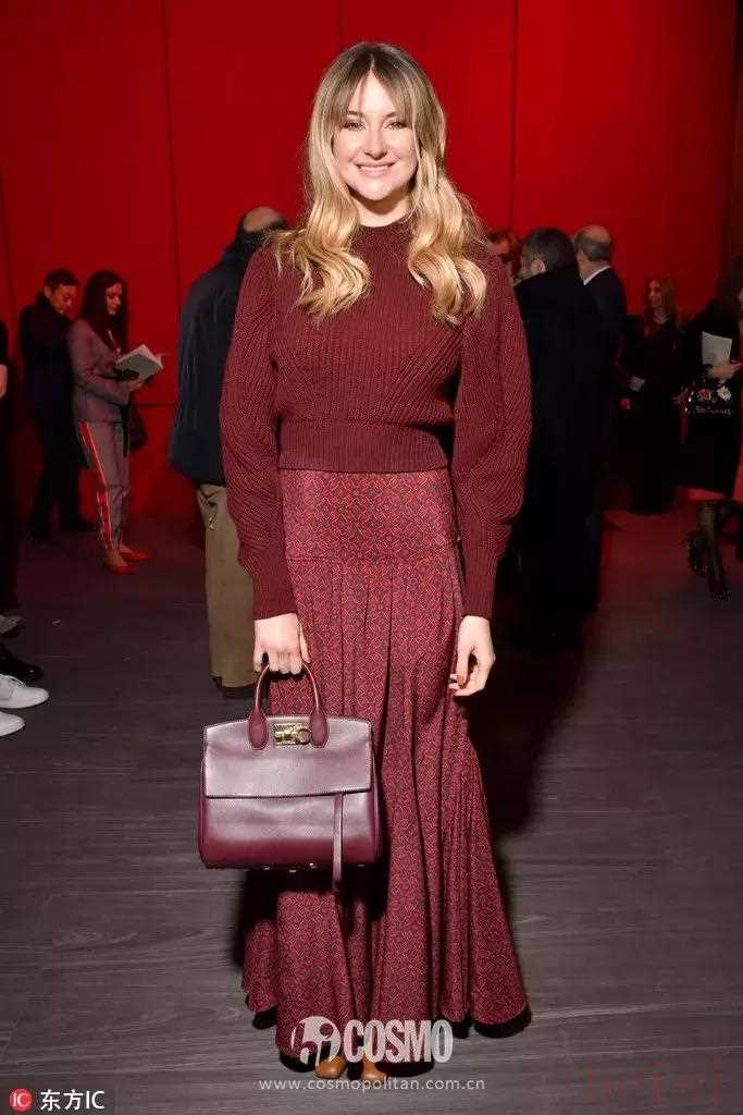 從小美到大的Shailene Woodley作為嘉賓前來(lái)Salvatore Ferragamo秀場(chǎng),當(dāng)天身穿酒紅色毛衣搭配同色系印花魚(yú)尾裙,給整體造型增添了不少靈動(dòng)的美感。