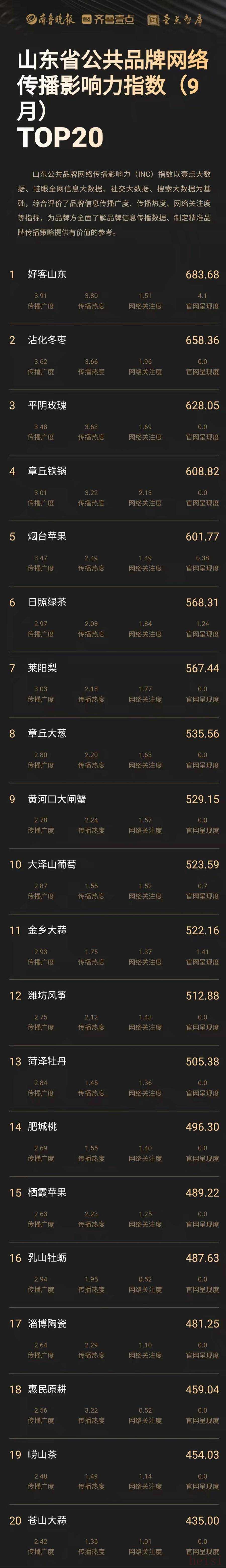 INC指數(shù)自去年推出后,提供了有關(guān)品牌的信息傳播數(shù)據(jù)、分析工具和評價系統(tǒng),助力品牌策劃與傳播,受到了地方政府、行業(yè)及企業(yè)的廣泛關(guān)注。相關(guān)數(shù)據(jù)在齊魯壹點智庫頻道進行展示。品牌方如果有這方面業(yè)務(wù)需求,可通過郵箱ydzk2020@163.com與壹點智庫聯(lián)絡(luò)。