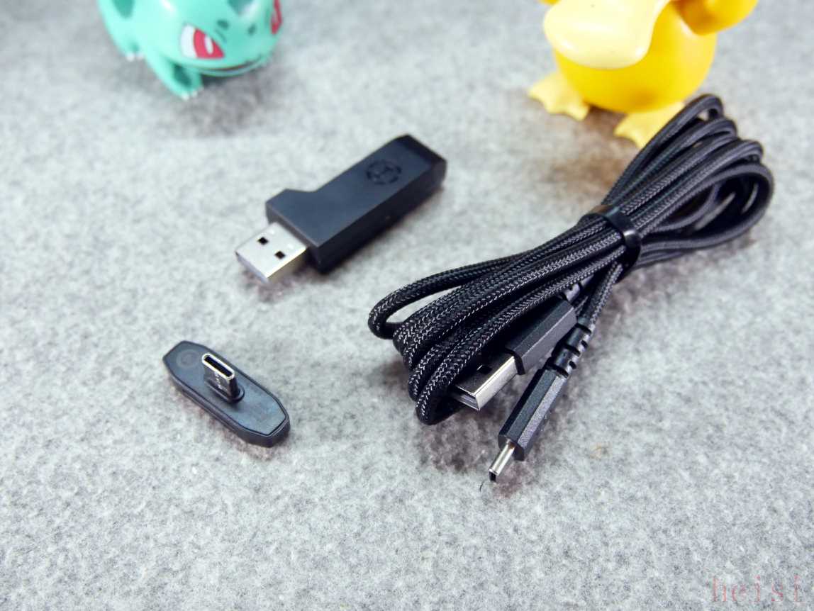耳機的配件方面也十分的豐富,一個可拆卸支持usb-A以及type-c的2.4G接收器,type-c接口的數(shù)據(jù)線,可拆卸的降噪麥克風,品牌說明書,貼紙等等。