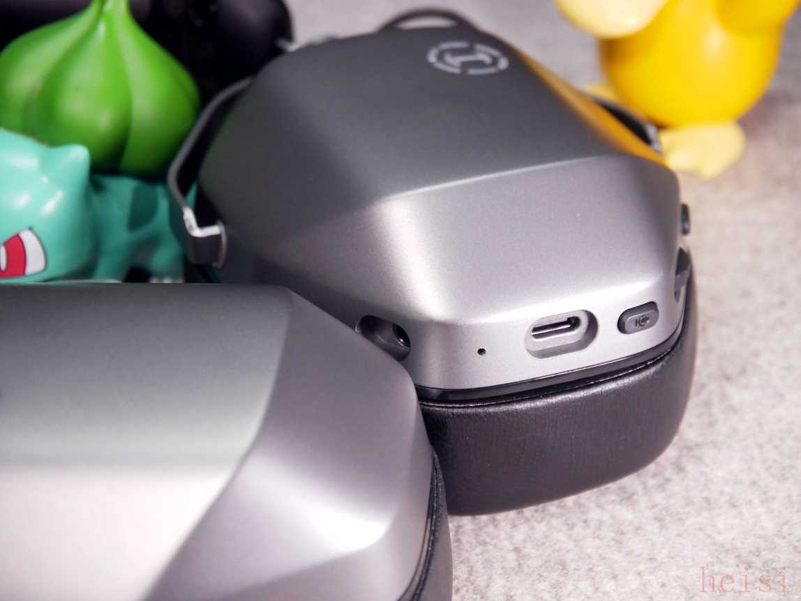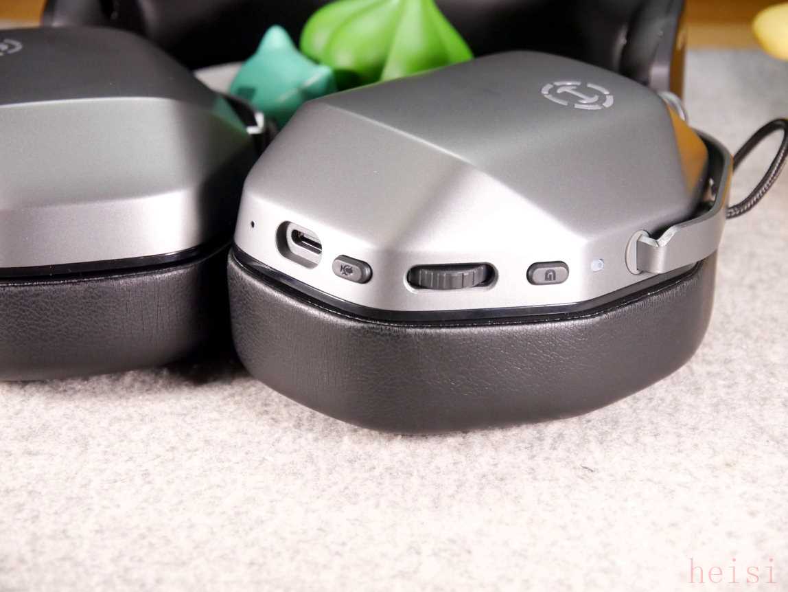 耳機的所有操作功能都集中在了耳機的左半邊,圖中從右到左分別是降噪麥克風+led組合(燈光展示耳機的各種模式狀態(tài),電量信息等等),功能G鍵(電源開關,播放音樂,接聽電話都可以通過單擊,長按,連擊等等進行),無極調(diào)節(jié)的音量旋鈕,麥克風的開關, type-c的數(shù)據(jù)充電接口,第二個降噪麥克風,以及可拆卸的麥克風插拔口。