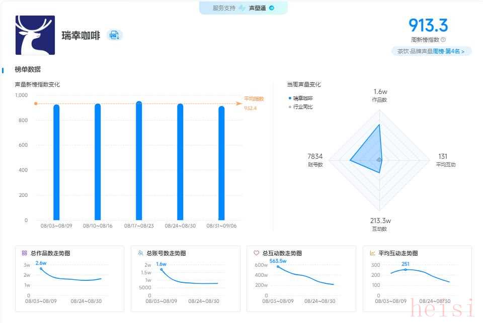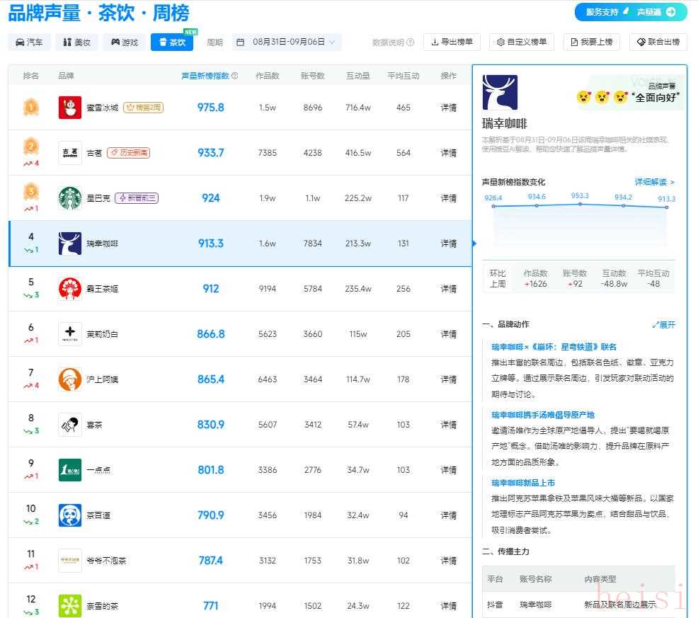 新榜品牌聲量?茶飲周榜(08 月 31 - 09 月 06 日)發(fā)布,瑞幸咖啡以 913.3 的聲量新榜指數位居第四 ,在茶飲市場中持續(xù)保持著強勁的競爭力。