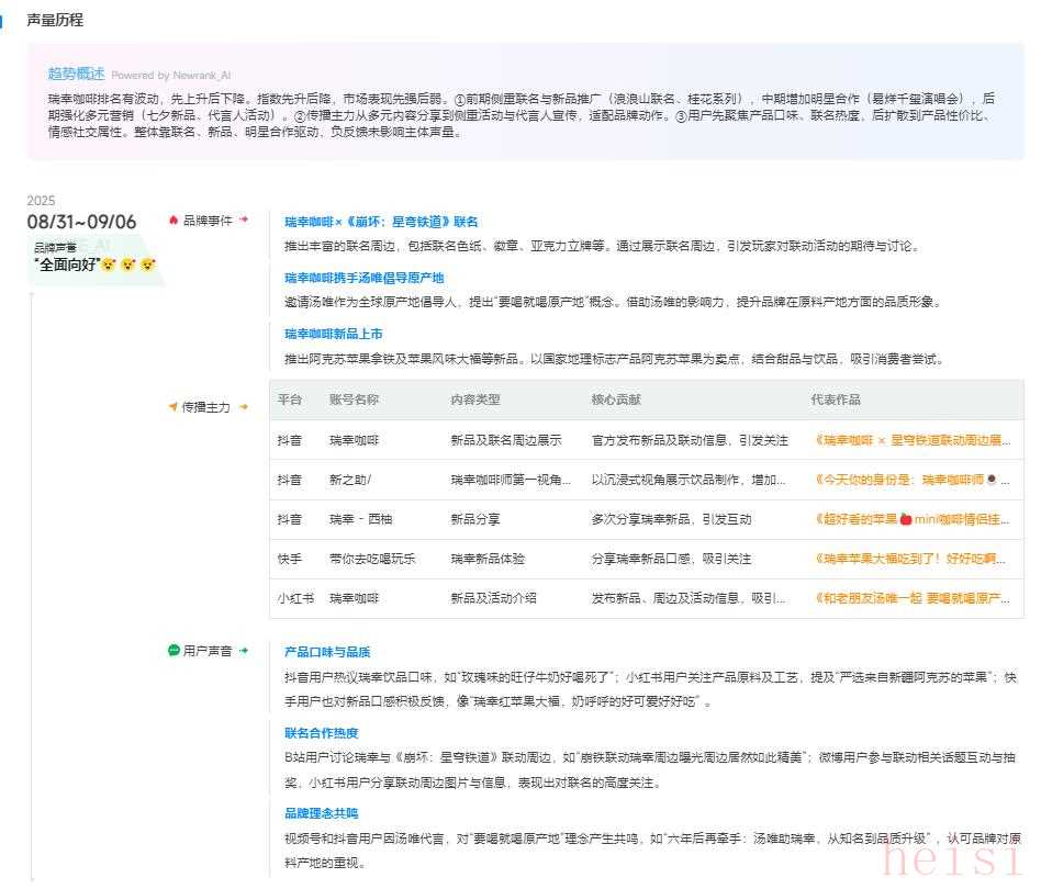 - 聯名合作熱度 B站用戶討論瑞幸與《崩壞:星穹鐵道》聯動周邊,如“崩鐵聯動瑞幸周邊曝光周邊居然如此精美”;微博用戶參與聯動相關話題互動與抽獎,小紅書用戶分享聯動周邊圖片與信息,表現出對聯名的高度關注。
