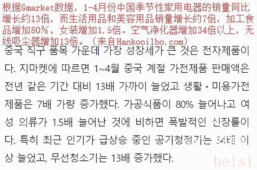 韓國日報曾發(fā)表文章稱,根據Gmarket的數據,2018年1至4月份,中國季節(jié)性家用電器在韓國的銷量同比增長約13倍,生活用品和美容用品的銷量增長約7倍,加工食品增加80%,女性服裝增加1.5倍。但更值得注意的是,空氣凈化器增加了34倍以上,無線吸塵器增加了13倍。