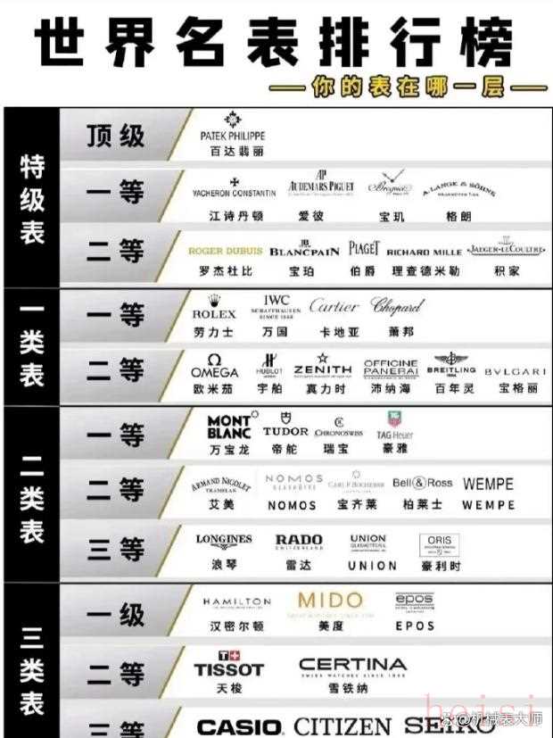 手表的等級確實(shí)是一個(gè)復(fù)雜且主觀的話題,它涉及到品牌、歷史、工藝、材質(zhì)、功能以及最重要的——佩戴者的品味和需求。所謂的“鄙視鏈”更多是一種網(wǎng)絡(luò)上的戲謔說法,不同的人有不同的看法,而且也在不斷變化。