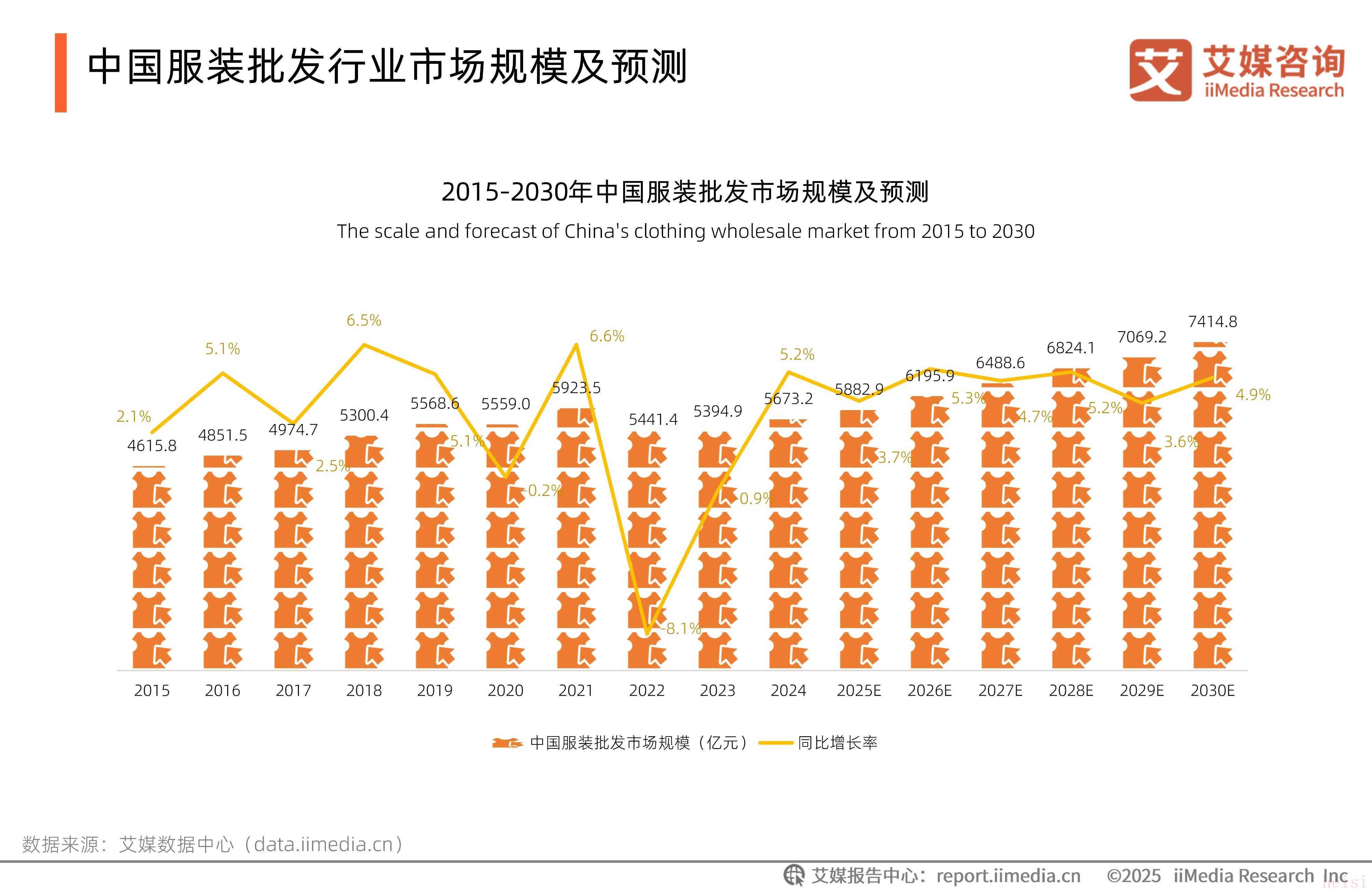 當(dāng)下,服裝行業(yè)正迎來細(xì)分機(jī)遇。消費(fèi)者需求的日趨多元推動企業(yè)深耕垂直賽道,加之國家提振消費(fèi)專項行動、假期促銷與直播電商等新業(yè)態(tài)激活市場,居民衣著消費(fèi)需求得以持續(xù)釋放,帶動服裝行業(yè)規(guī)模穩(wěn)步增長。iiMedia Research(艾媒咨詢)數(shù)據(jù)顯示,2024年中國服裝批發(fā)市場規(guī)模已達(dá)5673.2億元,同比增長5.2%,預(yù)計到2030年將進(jìn)一步攀升至7414.8億元。