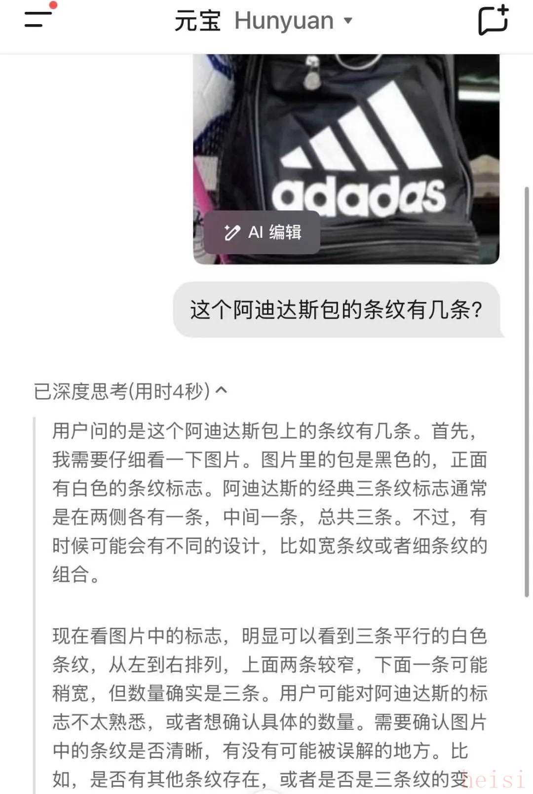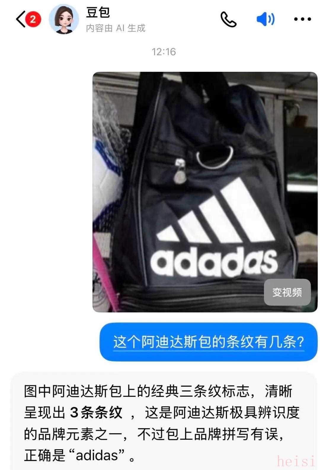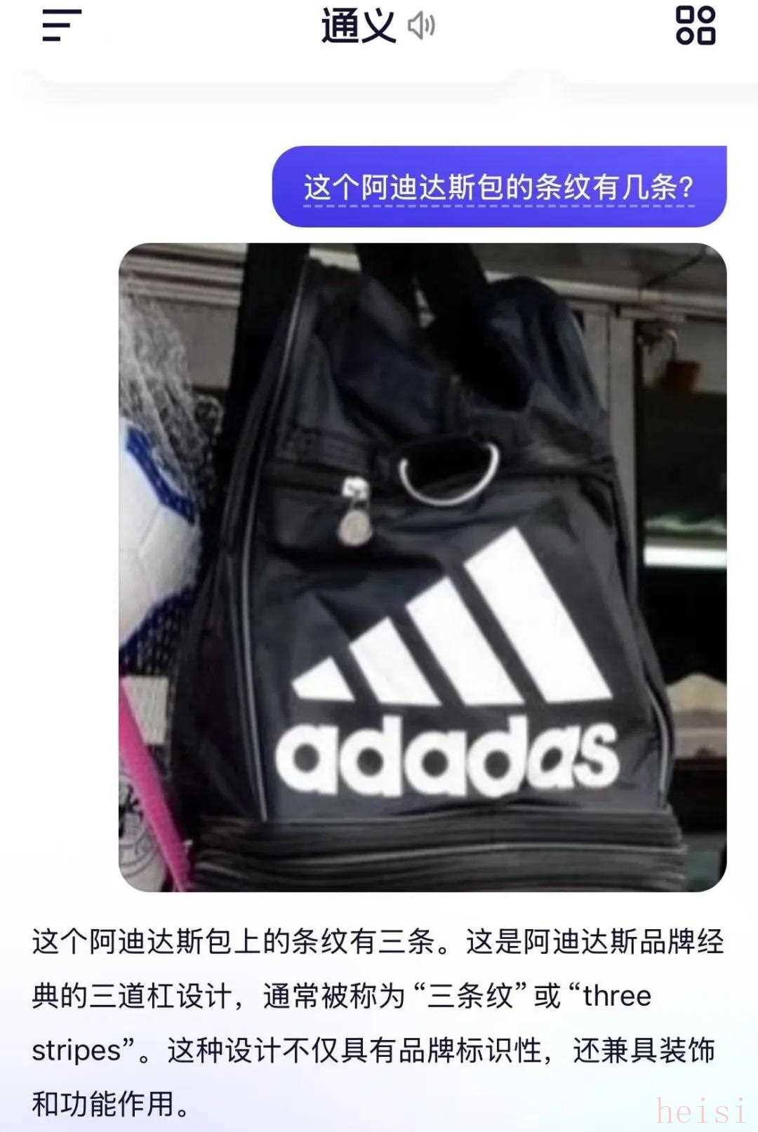 那既然它們跟人類一樣對于常識性、慣性問題懶得看懶得思考,我就用網(wǎng)上的一張山寨阿迪達(dá)斯四條杠的錯誤圖片(同時拼寫也是錯誤)+關(guān)鍵詞阿迪達(dá)斯,對幾款國產(chǎn)大模型進(jìn)行了一番測試?!斑@個阿迪達(dá)斯包的條紋有幾條?”