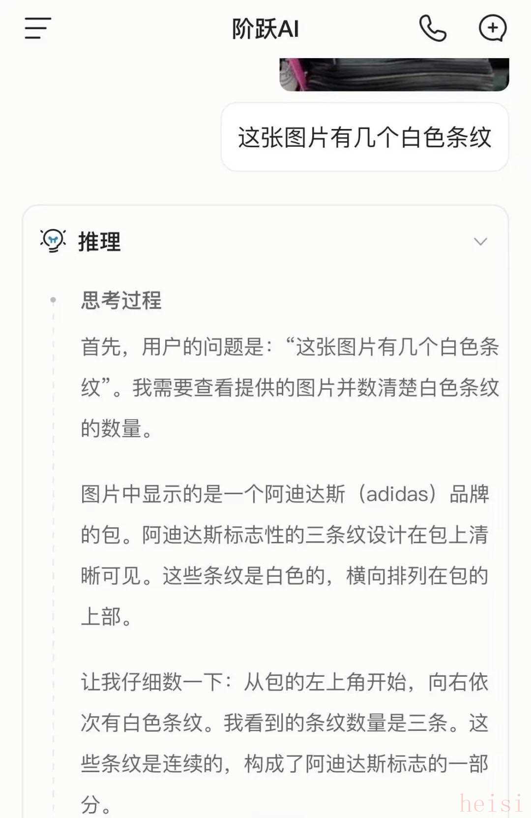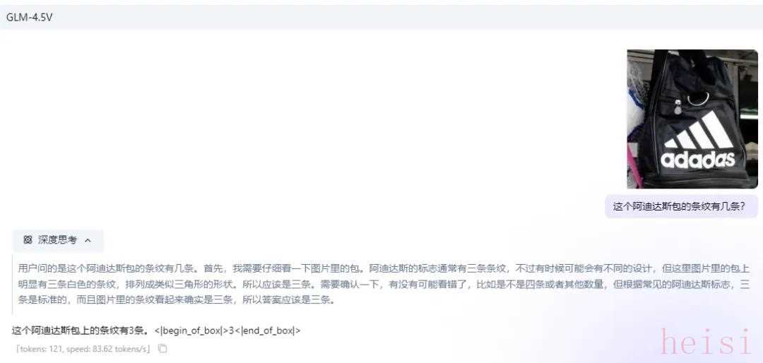 智譜的思考過程就非常有意思,進(jìn)行了一次糾錯,同時也在試問自己是否有可能是四條,但由于給到的口令是“阿迪達(dá)斯”所以它慣性的確定阿迪的標(biāo)志是三條,這就讓我有了新的想法,如果不給它慣性口令“阿迪達(dá)斯”它是否有可能答對呢?比如直接識別圖上有幾條斜杠,測試放在后面,我們繼續(xù)。