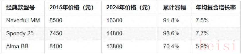 經典款型號2015年價格(元)2024年價格(元)累計漲幅年均復合增長率Neverfull