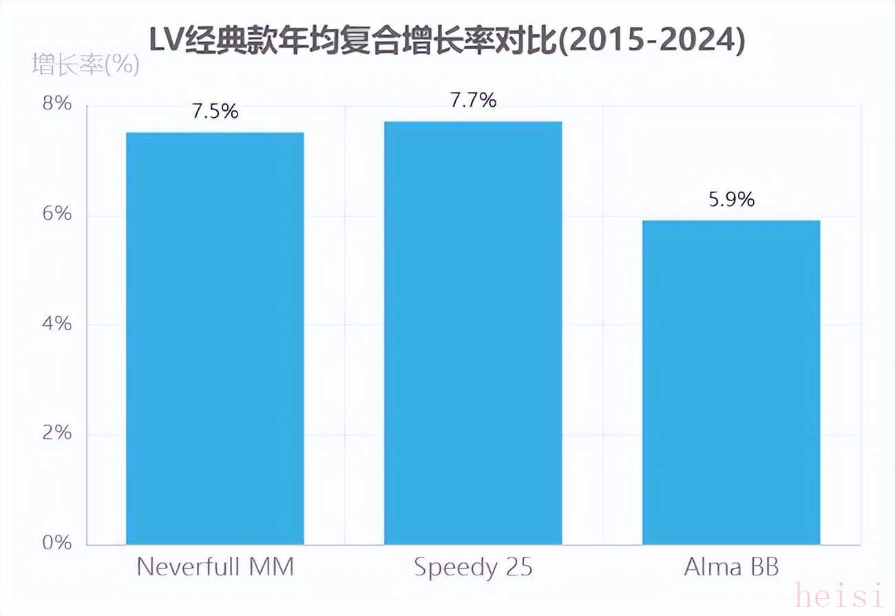 如果說奢侈品也有"理財屬性",那LV經典款大概是最讓人安心的"定期存款"——每年準時漲利息,還不用操心市場波動。像Neverfull、Speedy這樣的經典系列,就像品牌定價體系里的"壓艙石",以7%-8%的年均復合增長率穩(wěn)健增值,完美詮釋了什么叫"買了不后悔,賣了不虧"。