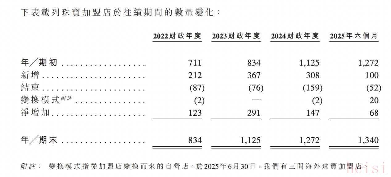 于2025年6月30日,潮宏基合共擁有1538家線下珠寶門店。具體而言,公司的銷售網(wǎng)絡包括在全國200多個城市的201家自營店和1337家加盟店,另外設有四家海外門店,包括一家位于馬來西亞自營店、一家泰國加盟店,以及兩家柬埔寨加盟店。