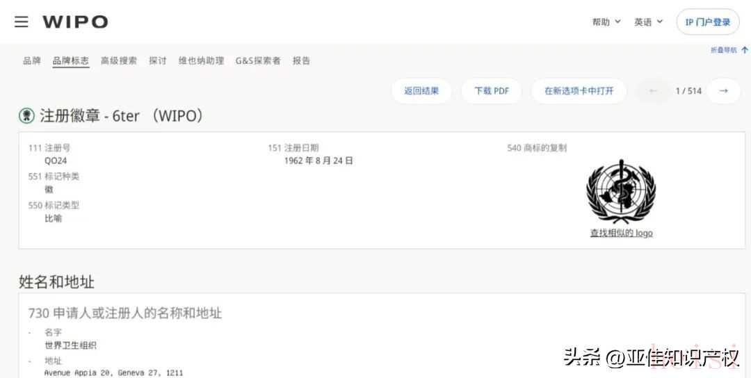 比如「世界衛(wèi)生組織」的徽章注冊檔案▼