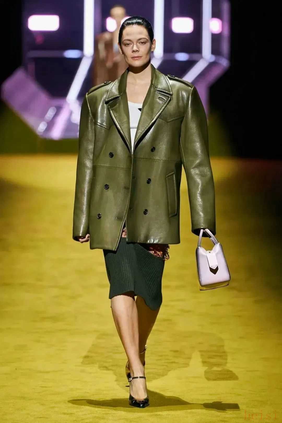 Miuccia Prada用Prada和Miu Miu兩個(gè)品牌進(jìn)行了一場(chǎng)關(guān)于夾克的流行實(shí)驗(yàn)。從2022春夏系列開(kāi)始,Miuccia用三場(chǎng)秀奠定了夾克在未來(lái)2年的流行趨勢(shì)——做舊效果、老干部夾克、廓形皮衣,夾克正在與時(shí)髦一詞畫(huà)上等號(hào)。