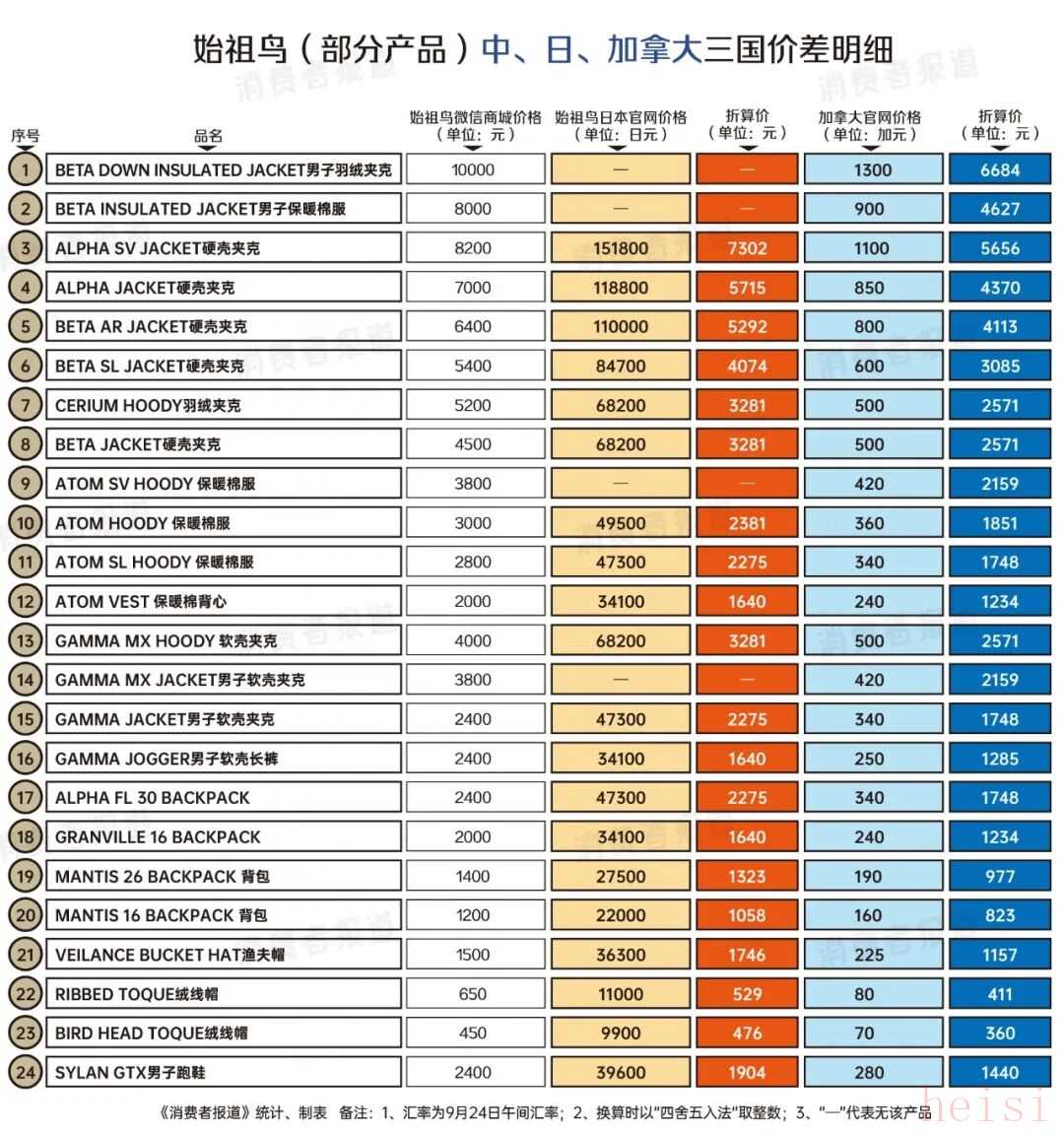 我們來分析一下這個信息:“始祖鳥國內(nèi)外價格對比:24款產(chǎn)品中23款價格較國外高,最高價差超3000元”。