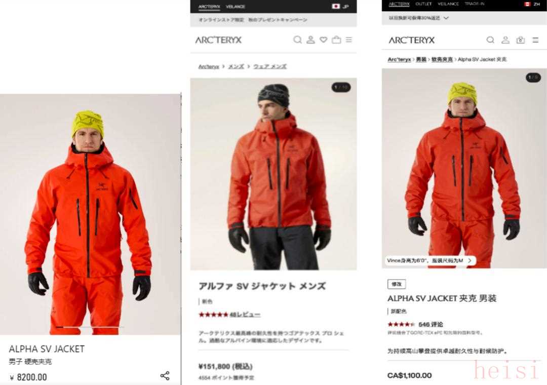 在始祖鳥微信商城,硬殼頂配Alpha SV的售價為8200元。但《消費者報道》記者發(fā)現(xiàn),在日本始祖鳥官網(wǎng)上,該款產(chǎn)品的售價為151800日元,折合人民幣約7302元(以9月24日午間匯率計算,下同)。在加拿大始祖鳥官網(wǎng),該款產(chǎn)品的售價為1100加元,折合人民幣約5656元。