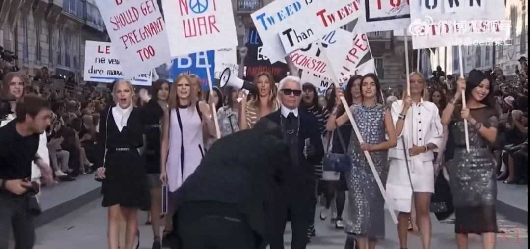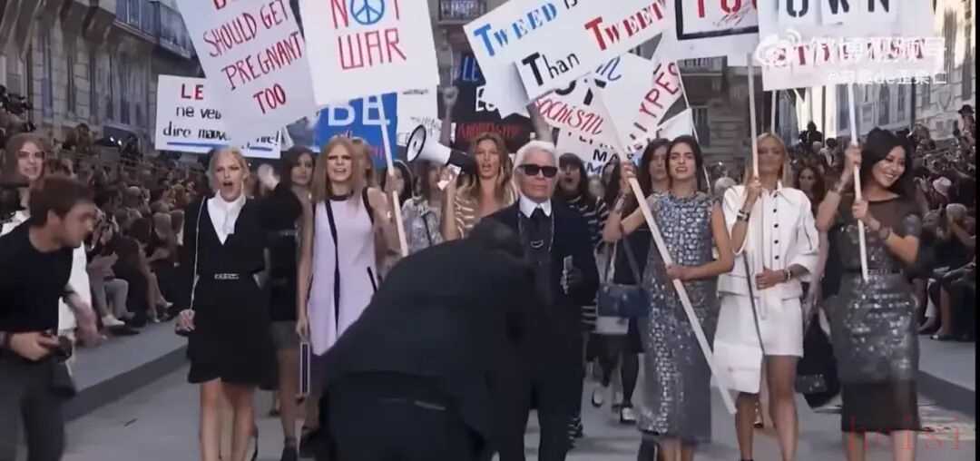 1.把秀場(chǎng)作為價(jià)值觀的擴(kuò)音器。比如香奈兒2015年春夏成衣秀,模特舉著標(biāo)語(yǔ)在T臺(tái)上游行,高喊“Ladies First”。那一刻,觀眾看到的不再是一場(chǎng)安靜的走臺(tái),而是一場(chǎng)政治宣言。香奈兒借由這種舞臺(tái)敘事,把品牌與“女性獨(dú)立”的價(jià)值觀牢牢綁定。對(duì)于一個(gè)以女性顧客為核心的奢侈品牌來(lái)說(shuō),這種符號(hào)化敘事,比單純展示華麗衣服更能產(chǎn)生情感共鳴。那一季的報(bào)道幾乎都強(qiáng)調(diào)了“女權(quán)”“女性力量”,服裝反而成了載體。