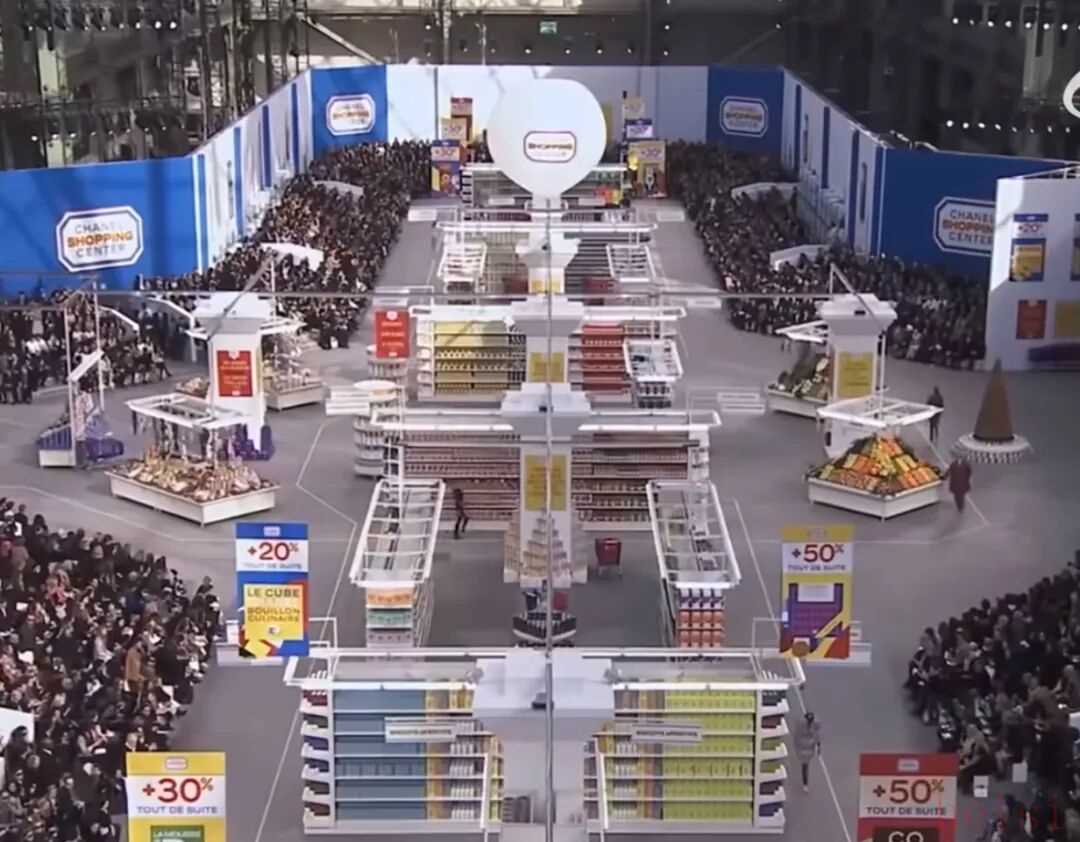 2.生活場(chǎng)景化,把奢侈品敘事放進(jìn)日常語(yǔ)境。2014年巴黎大皇宮被改造成全功能的超市,貨架上擺滿成百上千件印著香奈兒Logo的日用品:果汁、餅干、清潔劑、甚至購(gòu)物籃。模特推著購(gòu)物車(chē)走過(guò)過(guò)道,仿佛在逛超市。散場(chǎng)時(shí),觀眾沖上貨架哄搶“道具”,這場(chǎng)面成為社交網(wǎng)絡(luò)的經(jīng)典記憶。