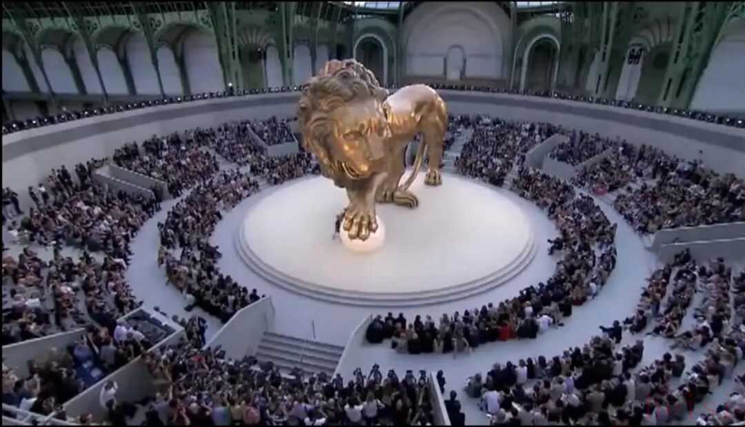 2010年,卡爾在巴黎大皇宮放置了一只高達(dá)十米的金色獅子,象征可可·香奈兒的獅子座。模特從獅子腳下走過(guò),仿佛在完成一場(chǎng)神圣儀式。觀眾或許記不清那一季的所有服飾,卻不會(huì)忘記那頭獅子。這就是裝置藝術(shù)的力量,“它把抽象符號(hào)轉(zhuǎn)化為巨型可視物,成為記憶的錨點(diǎn)”。