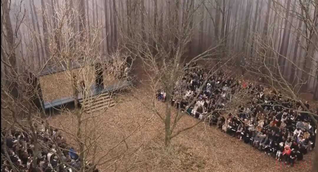 1.超現(xiàn)實(shí)場(chǎng)景化,用自然植物營(yíng)造震撼感。2008年的大皇宮中央矗立起巨型冰山,模特穿著毛皮與針織在冰川間穿行,那一年“氣候變化”正是國(guó)際熱點(diǎn);2018年的森林秀,整座大皇宮被鋪滿落葉,樹(shù)木被搬進(jìn)室內(nèi),仿佛觀眾進(jìn)入了一片秋天的林地。模特在落葉上走過(guò),腳步聲與沙沙作響的樹(shù)葉聲交織,讓整個(gè)場(chǎng)館充滿了季節(jié)感;還有“瀑布秀”,真正的水從舞臺(tái)上傾瀉而下,模特在水聲中行走。