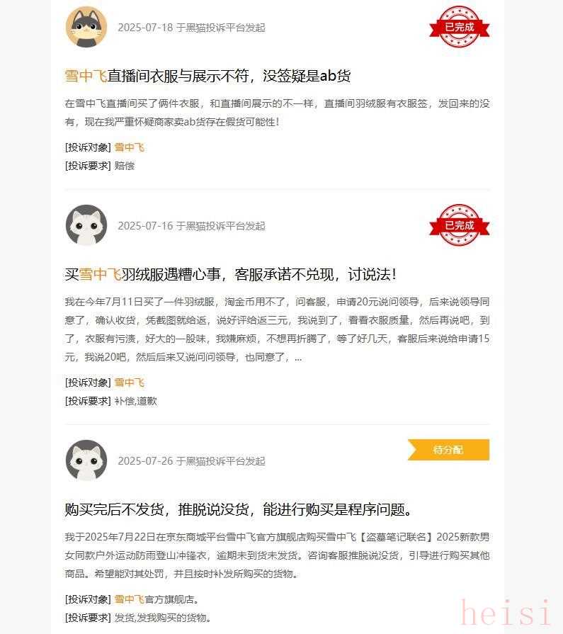 目前公開信息顯示,雪中飛系國內(nèi)知名羽絨服企業(yè)波司登旗下品牌,主打年輕化市場,以時尚設(shè)計和性價比著稱。記者在黑貓投訴平臺上搜索發(fā)現(xiàn),有不少消費者反映關(guān)于該品牌質(zhì)量等問題的疑慮。