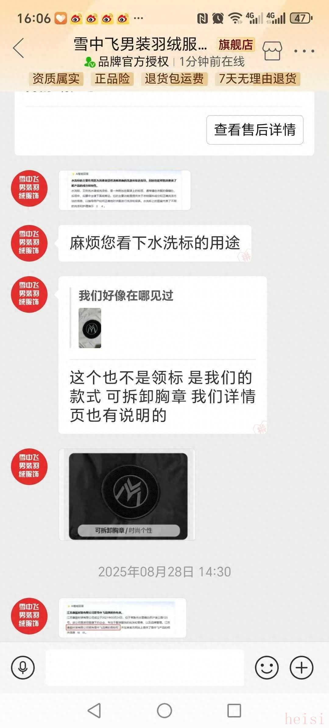 王先生提供的商品照片顯示,吊牌上的雪中飛二維碼經(jīng)多次嘗試無法正常掃描識別,吊牌標(biāo)注信息和水洗標(biāo)信息對應(yīng)不上,唯一一個帶有圖形標(biāo)志的地方,被店鋪客服稱為“可拆卸徽章”,并明確告知“并非領(lǐng)標(biāo)”。王先生懷疑自己買到的要么是貼牌生產(chǎn)的商品,要么就是假貨。