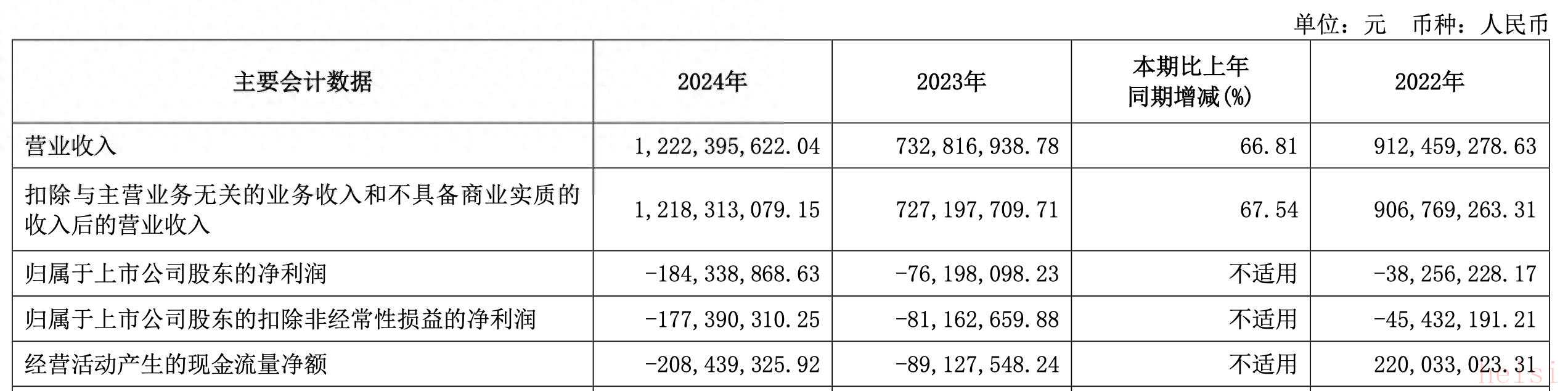財報顯示,2024年萊紳通靈實(shí)現(xiàn)營業(yè)收入約為12.22億元,同比增長66.81%。然而與營收增長形成鮮明對比的是,萊紳通靈并沒有因此賺到錢,反而出現(xiàn)了虧損加劇的情況。2024年歸屬于上市公司股東的凈虧損1.84億元,相較于2023年同期凈虧損7619.81萬元,虧損幅度進(jìn)一步擴(kuò)大。